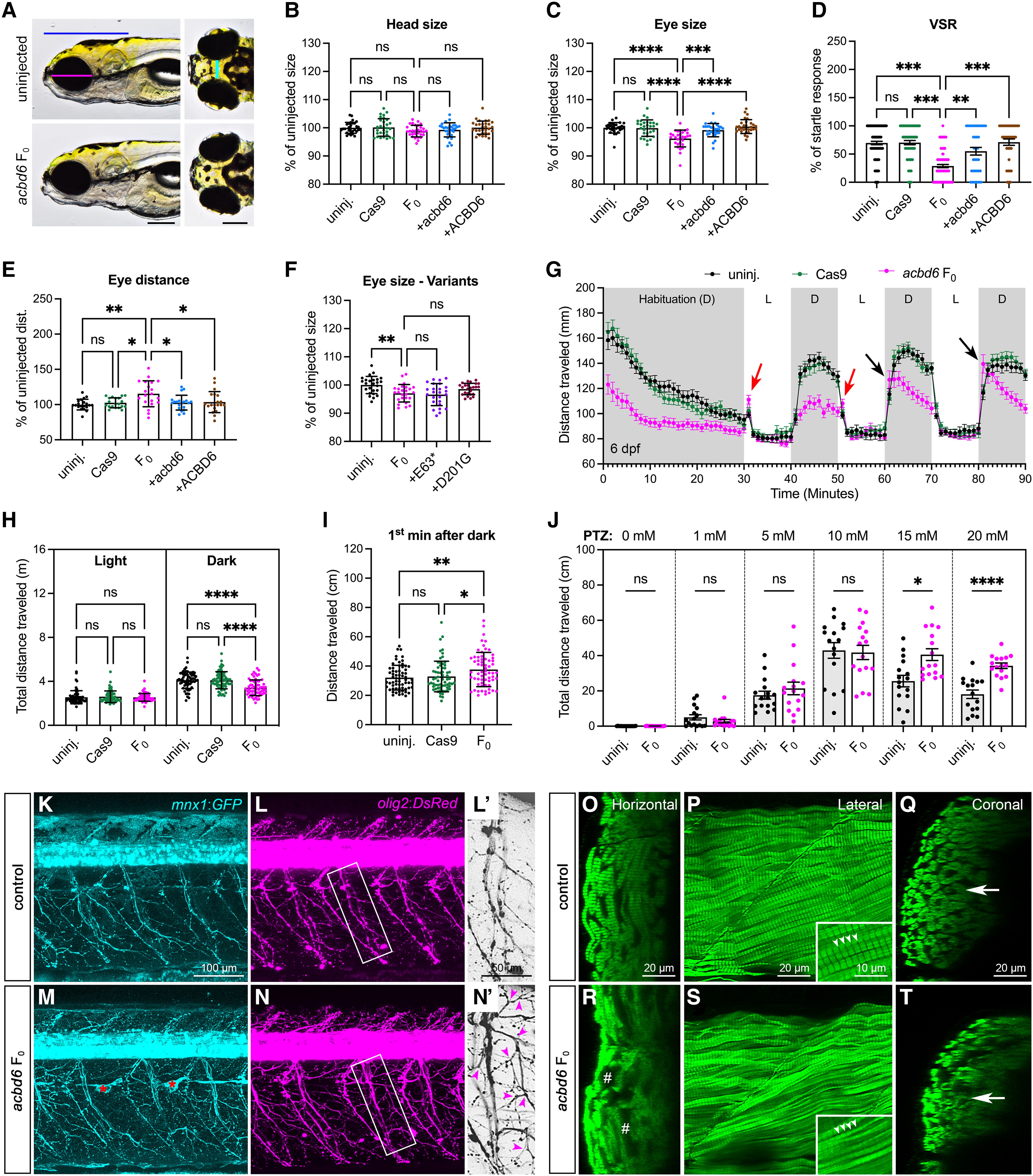 Figure 4. Zebrafish acbd6 F0 knockouts exhibit increased susceptibility to chemical-induced seizures, excessive motor neuron branching and skeletal muscle degeneration. (A) Representative images of uninjected control and acbd6 F0 larvae at 6 days post-fertilization (dpf). Left: Ventral view, anterior to the left. Right: Dorsal view, anterior to the left. Blue line indicates head size; magenta line indicates eye size; and cyan line indicates eye distance. Scale bar = 0.2 mm. (B and C) Quantification of the head and eye size (n = 30 larvae for each group) of uninjected control (uninj.), acbd6 F0 knockout (F0), F0 + zebrafish wild-type acbd6 mRNA (+acbd6) and F0 + human wild-type ACBD6 mRNA (+ACBD6) as indicated in B. (D) The visual startle response (VSR) analysis after mRNA rescue at 6 dpf. n = 36 larvae for each group. Each symbol represents one larva. The number of responses to five stimuli of each larva was calculated as a percentage of responses. Error bars = mean ± standard error of the mean (SEM). (E) Quantification of the eyes distance (n = 20 larvae for each group) as indicated in B. (F) Quantification of the eye size of F0 knockout rescued with mRNA of human p.Glu63Ter (+E63*) or p.Asp201Gly (+D201G) variant. n = 25 larvae for each group. (G) Locomotor activities of zebrafish larvae in light and dark conditions at 6 dpf. n = 64 larvae for each group. The larvae were habituated in the dark for 30 min, followed by three cycles of 10-min periods of light and dark. Error bars represent the mean ± SEM. D = dark period; L = light period. Red arrows indicate increased movement of F0 1 min after light on, and black arrows indicate increased movement 1 min after light off. (H) Average cumulative distance travelled by each larva during three cycles of either light or dark periods in G. Error bars = mean ± standard deviation (SD). (I) The average cumulative distance traveled by each larva during the first minute of the dark period was measured over three cycles, as shown by the black arrow in G. Error bars represent the mean ± SD. (J) The average cumulative distance traveled by the larvae was measured for each group after being treated with different doses of pentylenetetrazole (PTZ) at 5 dpf. n = 16 larvae for each group. (K–N) Confocal images of Tg(mnx1:GFP; olig2:DsRed) larva at 12 dpf are shown, with transgenic larvae injected with slc45a2 sgRNA used as a control and those injected with acbd6 + slc45a2 sgRNAs shown as acbd6 F0. (L' and N') Enlarged images from white boxes are shown in L' and N', with red asterisks indicating autofluorescence from remaining pigment cells. GFP and DsRed are displayed in cyan and magenta, respectively, with magenta arrowheads indicating excess axonal arborizations. The images are presented in a lateral view, with anterior to the left and dorsal to the top. Additional motor neuron phenotypes at 6 and 12 dpf can be found in Supplementary Fig. 13. (O–T) Confocal images of stained skeletal muscle fibers with phalloidin are presented, including images from slc45a2 sgRNA-injected control (O–Q) and acbd6 + slc45a2 sgRNA-injected (R and S) larvae at 12 dpf. Orthogonal views generated from P and S using the Orthogonal views tool in ImageJ are also displayed. #Degenerated muscles. White arrowheads and a white arrow indicate Z-discs and the thickness of the myotube, respectively. Supplementary Fig. 14 provides additional muscle phenotypes at 6 and 12 dpf. In B–D and F, one-way ANOVA with Tukey’s multiple comparisons test; E and H–J, one-way ANOVA with Dunnett’s T3 multiple comparisons test; ns, not significant; *P < 0.05; **P < 0.01; ***P < 0.001; ****P < 0.0001. |