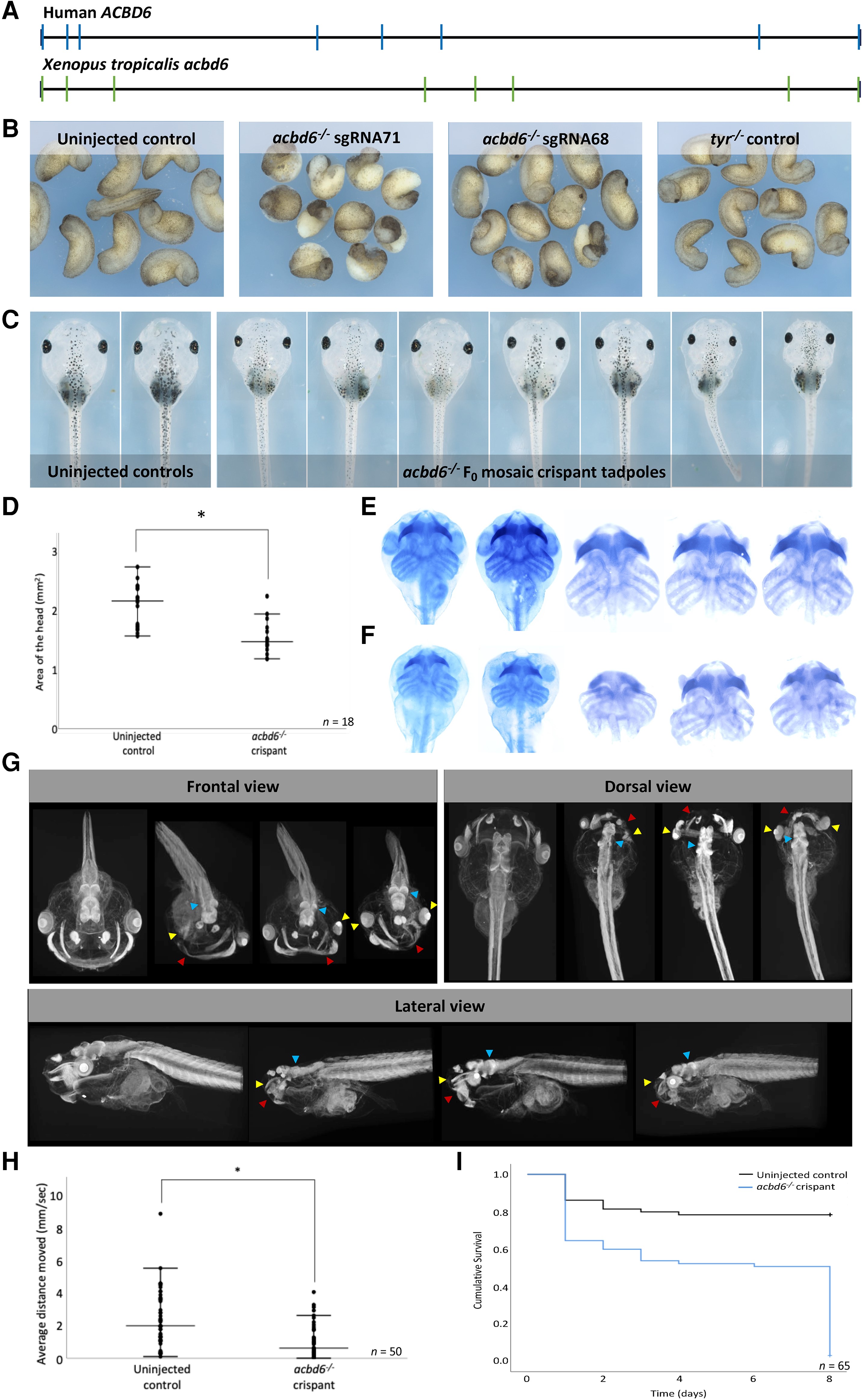Figure 5. Xenopus tropicalis (acbd6) crispants have gastrulation, movement, craniofacial, brain and eye defects together with microcephaly. (A) The gene structure of human (ACBD6) and X. tropicalis (acbd6) reveals eight exons. (B) Gastrulation defects, including failure of blastopore closure and anterior posterior defects, were observed in F0X. tropicalis embryos injected with two different CRISPR/Cas9 constructs (sgRNA-68 and sgRNA-71) disrupting exon 1 of acbd6. (C) Those animals surviving to free-feeding stages presented with microcephaly, craniofacial dysmorphism and eye abnormalities. (D) The differences in head size between the uninjected control (2.07 0.36mm) and acbd6 crispant tadpoles (1.52 0.27mm, sgRNA-68) were found to be significant, t(34) = 5.183, P < 0.001. (E and F) Alcian blue staining marking the cartilaginous structures in the head and neck show equivalent structures between control (E) and acbd6 crispant tadpoles (F), revealing no gross morphological abnormalities. (G) Detailed structural analysis in higher resolution microCT imaging (1% phosphotungstic acid contrast stain) revealed significant structural abnormalities in the facial musculature (red arrows; G), abnormalities of the eye (microphthalmia, anophthalmia; yellow arrows, G) and structural abnormalities in the brain most pronounced in the midbrain regions (blue arrow, G). (H) Locomotion analysis at NF44/45 revealed that crispants moved significantly less than control tadpoles. (I) The KaplanMeier survival analysis of 65 control and crispant tadpoles shows two periods of crispant-specific decline, the first at gastrula stages (Day 01) and the second with post-feeding [Day 8, Nieuwkoop and Faber (NF) stage 47]. |