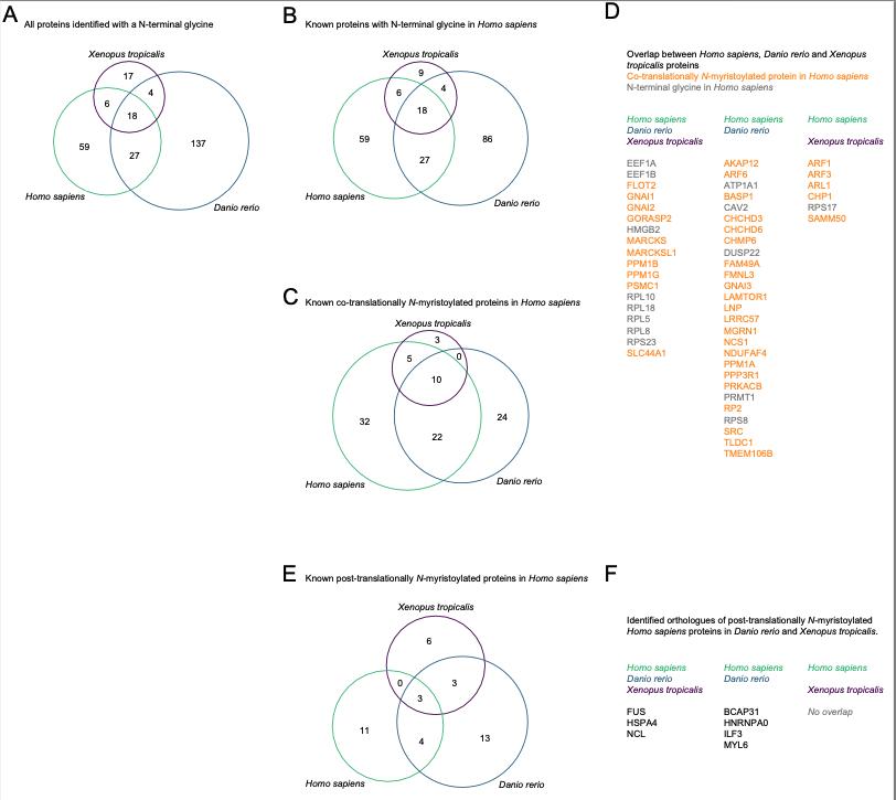 Supplementary Figure 23. Comparison of overlap in identified (potential) N- myristoylated proteins between Homo sapiens, Danio rerio and Xenopus tropicalis (A) Venn diagram depicting overlap between proteins identified in Homo sapiens, Danio rerio and Xenopus tropicalis containing a N-terminal glycine. (B) Venn diagram depicting overlap between proteins with a N-terminal glycine identified in Homo sapiens, Danio rerio and Xenopus tropicalis, which have an orthologue with a N-terminal glycine in Homo sapiens. (C) Venn diagram depicting overlap between proteins with a N-terminal glycine identified in Homo sapiens, Danio rerio and Xenopus tropicalis, which have a co-translationally N-myristoylated orthologue in Homo sapiens. (D) List of potential co-translationally N-myristoylated proteins overlapping between Homo sapiens, Danio rerio and Xenopus tropicalis. Danio rerio and Xenopus tropicalis proteins with an orthologue in Homo sapiens with a N-terminal glycine are depicted in gray, with a co-translationally N-myristoylated orthologue in Homo sapiens in orange. (E) Venn diagram depicting overlap between proteins identified in Homo sapiens, Danio rerio and Xenopus tropicalis, which have a post-translationally N-myristoylated orthologue in Homo sapiens. (F) List of potential post-translationally N-myristoylated proteins overlapping between Homo sapiens, Danio rerio and Xenopus tropicalis. |