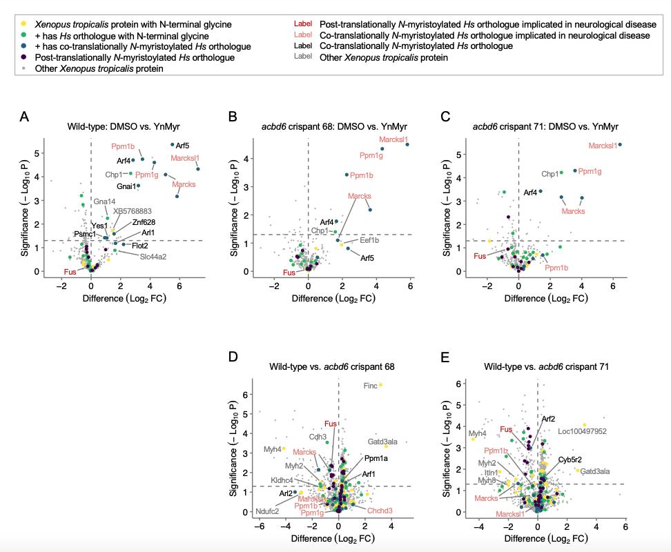 Supplementary Figure 21. Chemical and whole proteome analysis of wild-type and acbd6 crispant X. tropicalis (back) (A) Volcano plot depicting YnMyr labelling of proteins in wild-type X. tropicalis. Horizontal dotted line: significance threshold (p-value = 0.05). FC: fold-change. Position on the left equals increased in DMSO condition (negative control), position on the right equals increased in YnMyr condition (positive control). Highlighted are proteins with well-validated N-myristoylated orthologues in Homo sapiens (black) including those implicated in neurological disorders (orange). (B) YnMyr labelling of proteins in acbd6 crispant 68 X. tropicalis. Further description as in (A). (C) YnMyr labelling of proteins in acbd6 crispant 71 X. tropicalis. Further description as in (A). (D) Whole proteome analysis of proteins in wild-type and acbd6 crispant 68 X. tropicalis. Horizontal dotted line: significance threshold (p-value = 0.05). FC: fold-change. Position on the left equals reduced in crispant, position on the right equals increased in crispant. Highlighted are proteins with well-validated N-myristoylated orthologues in Homo sapiens (black) including those implicated in neurological disorders (orange). (E) Whole proteome analysis of proteins in wild-type and acbd6 crispant 71 X. tropicalis. Further description as in (D). |