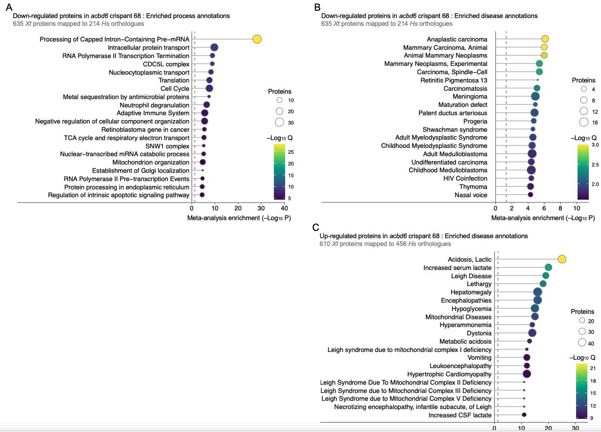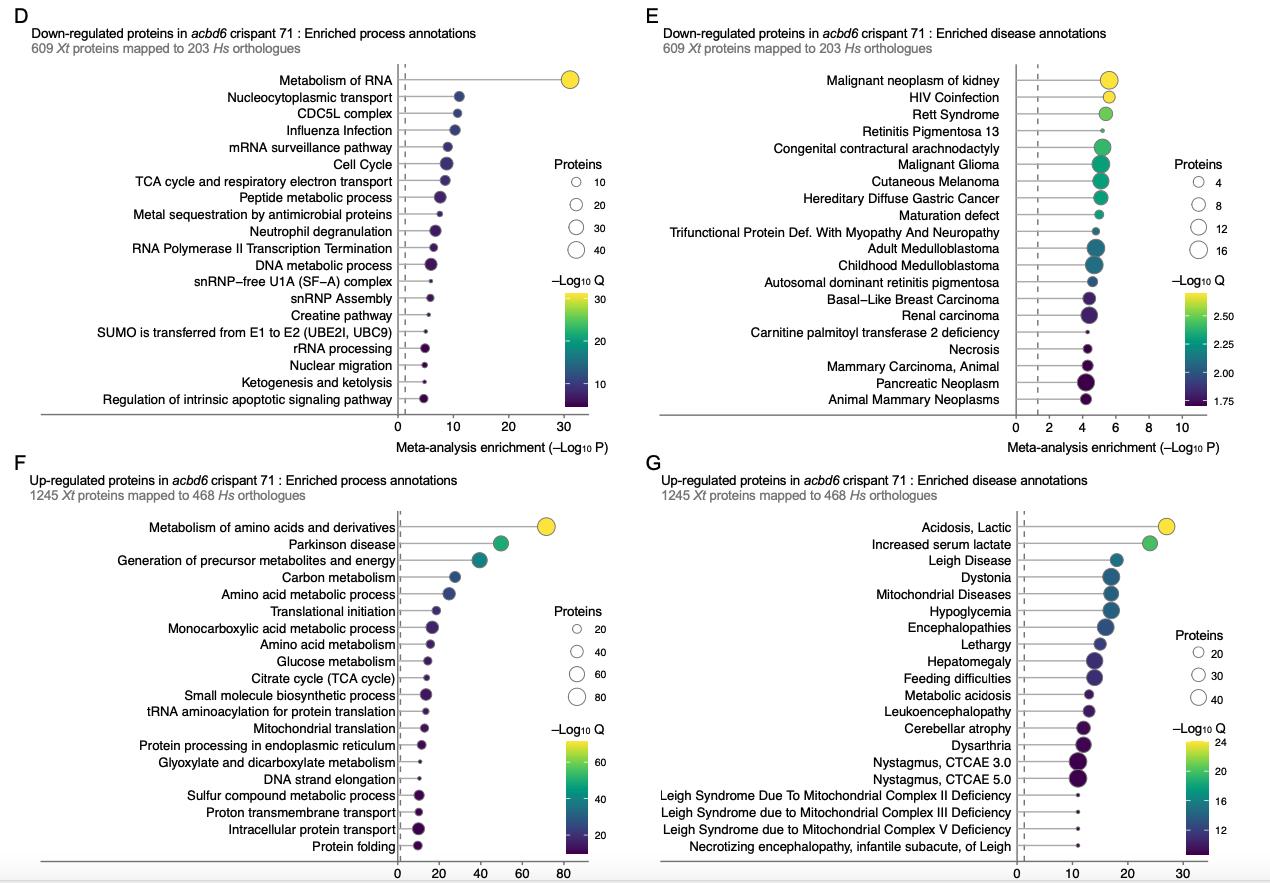Supplementary Figure 22. Whole proteome meta-analysis of wild-type and acbd6 crispant Xenopus [panels A-C] (A) Top-20 of biological processes most significantly enriched in proteins down-regulated in acbd6 crispant 68 X. tropicalis. Most significantly enriched process at the top. Colour indicates Q-value as secondary significance indicator. Size of circles indicates number of proteins enriched in depicted process. Xt: Xenopus tropicalis. Hs: Homo sapiens. (B) Top-20 of disease networks most significantly enriched in proteins down-regulated in acbd6 crispant 68 X. tropicalis. Further description as in (A). (C) Top-20 of disease networks most significantly enriched in proteins up-regulated in acbd6 crispant 68 X. tropicalis. Further description as in (A). ( |