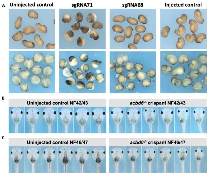 Supplementary Figure 17. Survival, movement and morphology of abcd6 cripspant tadpoles (A) Fertilised X. tropicalis eggs were obtained from two clutches and injected at the one-cell stage with Cas9 protein and 600pg of sgRNA-68 (GGACTCTTCCAGTACCCCAG) or sgRNA-71 (GGAGTGGGACGAGAAGACAG). Substantial numbers of the resulting F0 X. tropicalis crispant embryos bearing homozygous indels in exon 1 of acbd6 were observed to die at gastrula stages across both experiment. Embryos injected with sgRNA68 that were observed to develop normally compared to both uninjected and tyr-/- control embryos were subsequently found to have a single nucleotide polymorphism affecting the PAM (A, third panel top row). (B, C) Images show tadpole head morphology at two free-feeding stages, crispants were injected with sgRNA-68 (NF42/43 and NF46/47) and the presence of microcephaly, craniofacial defects and eye abnormalities noted. |