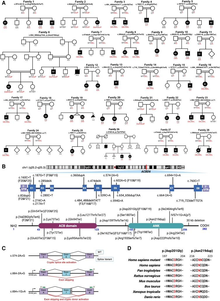 Figure 1. Family pedigrees, schematic variants’ representation, conserved regions of substitution variants in ACBD6, and splicing effects. (A) Pedigrees and segregation results for the 28 unrelated families. Double lines between individuals represent consanguinity. The 45 affected individuals recruited for the study are shaded and indicated with their respective subject (S) number (S1, S2 or S3). The segregation data for all individuals tested via Sanger sequencing are shown with the presence of the ACBD6 variant (red) and/or the reference allele (black), two red/black texts indicate a homozygous state and one red + one black text indicates a heterozygous state. The genotyping is based on the coding DNA sequence. DEL = deletion; DUP = duplication; WT = wild-type. (B) Top: Schematic representation of the gene and protein positions of detected variants in ACBD6. ACBD6 is located on chromosome 1 at cytogenetic position q25.2q25.3. Middle: The genetic variants mapped to the NM_032360.4 transcript of ACBD6. Bottom: ACBD6 variants mapped on the protein level. Three variants, including p.(Gly22fs), p.(Leu121ThrfsTer27) and a 30 kb deletion in the C-terminus, have been reported previously.6,7,10 Recurrent variants are labelled with family codes. (C) Splicing schematic for the c.574-2A>G (top) variant in ACBD6 showing cryptic acceptor splice site activation in exon 6. The c.664-2A>G (middle) and c.694+1G>A (bottom) variants affect splicing of exon 7 both show exon skipping. Additionally, the c.694+1G>A variant activates a cryptic donor splice site. (D) Interspecies alignment performed with Clustal Omega showing the complete conservation down to invertebrates of the amino acid residues affected by a missense variant leading to an amino acid substitution p.(Asp201Gly) and an in-frame duplication p.(Asn219dup). |