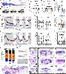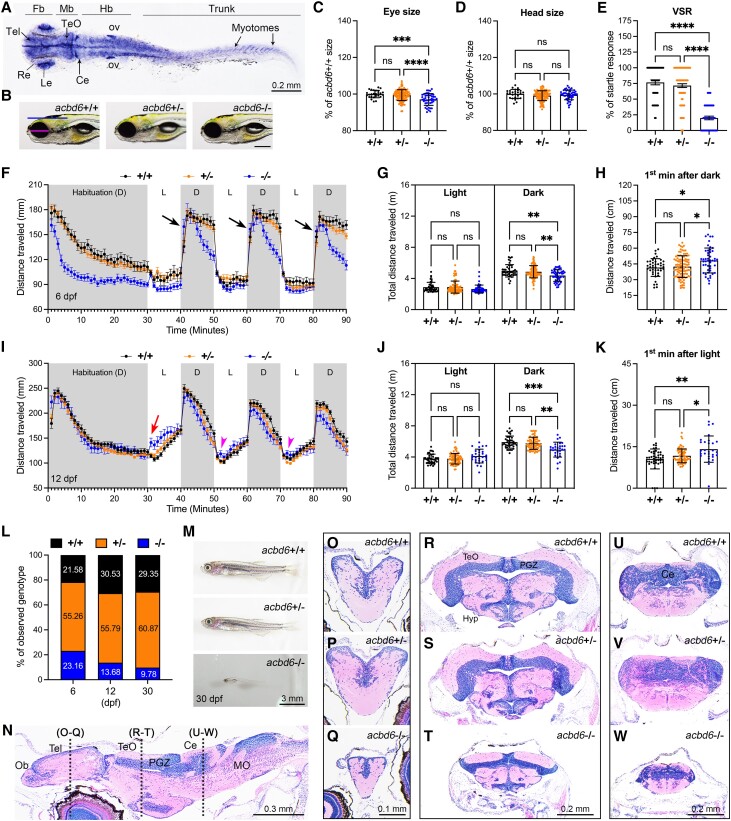 Figure 3 RISPR/Cas9 mutation of zebrafish acbd6 causes smaller eyes, impaired vision, abnormal locomotion, developmental delay and increased mortality. (A) Whole-mount in situ hybridization for detecting acbd6 mRNA expression pattern in zebrafish embryo at 24 hours post-fertilization (hpf). fb = forebrain; mb = midbrain; MHB = midbrain and hindbrain boundary; hb = hindbrain; ov = otic vesicle. Dorsal view to the top, anterior to the left. (B) Representative images of wild-type (acbd6+/+), heterozygous (acbd6+/−) and homozygous (acbd6−/−) mutant larva at 6 days post-fertilization (dpf). Head size and eye size are indicated by blue and red lines, respectively. Anterior to the left and dorsal to the top. Scale bar = 200 μm. (C and D) Quantification of eye and head size as indicated in B. +/+ (n = 26 larvae), +/− (n = 114 larvae) and −/− (n = 47 larvae). Each symbol represents one larva. Values are calculated as a percentage of the mean value of +/+ larvae. Error bars = mean ± standard deviation (SD). (E) The result of visual startle response analysis performed on +/+ (n = 43 larvae), +/− (n = 99 larvae) and −/− (n = 48 larvae) zebrafish larvae at 6 dpf. Each symbol represents one larva. The number of responses for five stimuli of each larva is calculated as a percentage of responses. Error bars = mean ± standard error of the mean (SEM). (F) Locomotor activities of zebrafish larvae in light and dark periods at 6 dpf. +/+ (n = 42 larvae), +/− (n = 99 larvae) and −/− (n = 48 larvae) zebrafish larvae were habituated in the dark for 30 min, followed by three cycles of 10-min time bins of light and dark periods. Black arrows indicate the increased movement of homozygous mutants at the first minute in the dark. Error bars = mean ± SEM. D = dark period; L = light period. (G) Average cumulative distance travelled by each larva from three cycles of either light or dark periods in F. Error bars = mean ± SD. (H) Average cumulative distance travelled by each larva during the first minute of the dark period across three cycles as indicated by black arrows in F. Error bars = mean ± SD. (I) Locomotor activities of zebrafish larvae in light and dark conditions at 12 dpf. +/+ (n = 39 larvae), +/− (n = 71 larvae) and −/− (n = 29 larvae). Error bars = mean ± SEM. Red arrow indicates increased movement of homozygous mutants at the first minute after light on. Red arrowhead indicates increased movement of homozygous mutants at the second minute after light on. (J) Average cumulative distance travelled by each larva during three cycles of either light or dark periods in I. Error bars = mean ± SD. (K) Average cumulative distance travelled by each larva during the first cycle of the first minute of the light period as indicated by red arrow in I. Error bars = mean ± SD. (L) Genotyping results of zebrafish at 6 dpf (n = 191 larvae), 12 dpf (n = 196 larvae) and 30 dpf (n = 118 juveniles) stages from acbd6+/− intercross. (M) Representative images of morphological phenotype from acbd6+/+, acbd6+/− and acbd6−/− at 30 dpf. Anterior to the left and dorsal to the top. (N) Sagittal section of acbd6+/+ brain at 30 dpf. Anterior to the left and dorsal to the top. MO = medulla oblongata; Ob = olfactory bulb; PGZ = periventricular grey zone of optic tectum. (O–W) Representative images of transverse sections of telencephalon (O–Q), optic tectum (R–T) and cerebellum (U–W) from acbd6+/+, acbd6+/− and acbd6−/− juvenile as indicated in N. In C and D, one-way ANOVA with Tukey’s multiple comparisons test; in E, G, H, J and K, one-way ANOVA with Dunnett’s T3 multiple comparisons test; ns, not significant; *P < 0.05; **P < 0.01; ***P < 0.001; ****P < 0.0001. |