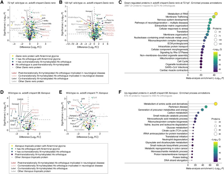 Figure 7 Chemical and whole proteome analysis of acbd6 wild-type and crispant zebrafish and Xenopus tropicalis model systems. (A) Volcano plot comparing myristic acid alkyne (YnMyr) labelling of proteins in wild-type and acbd6 crispant zebrafish at 72 h post-fertilization (hpf). (B) Comparing YnMyr labelling of proteins in wild-type and acbd6 crispant zebrafish at 120 hpf. Further description as in A. (C) Top 20 biological processes most significantly enriched in proteins downregulated in acbd6 crispant zebrafish at 72 hpf. (D) Volcano plot comparing YnMyr labelling of proteins in wild-type and acbd6 crispant 68 X. tropicalis. (E) Comparing YnMyr labelling of proteins in wild-type and acbd6 crispant 71 X. tropicalis. Further description as in D. (F) Top 20 biological processes most significantly enriched in proteins upregulated in acbd6 crispant 68 X. tropicalis. Most significantly enriched processes are at the top. In A and D, position on the left equals reduced in crispant; position on the right equals increased in crispant. Horizontal dotted line indicates significance threshold (P = 0.05). FC = fold-change. In C and F, the most significantly enriched process is at the top. Colour indicates Q-value as secondary significance indicator. Size of circle indicates a number of proteins enriched in the depicted process. Dr = Danio rerio; Hs = Homo sapiens; Xt = X. tropicalis. |