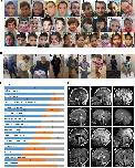 Figure 2. Clinical features of the affected individuals with bi-allelic ACBD6 variants. [A(i–xiii)] Representative photographs demonstrating facial features of the affected individuals in adulthood: F1:S1 (i); F1:S2 (ii); F1:S3 (iii); F3:S2 (iv); F3:S1 (v); F6:S1 (vi); F7:S2 (vii); F7:S1 (viii); F11:S1 (ix); F17:S1 (x); F17:S2 (xi); F20:S1 (xii); and F16:S1 (xiii). [A(xiv–xxxi)] Representative photographs demonstrating facial features of the affected individuals in childhood: F3:S2 (xiv) at 5 years old; F3:S1 (xv) at 12 years old; F6:S2 (xvi); F8:S1 (xvii); F8:S2 (xviii); F10:S1 (xix); F10:S2 (xx); and F11:S1 (xxi) at younger age; F13:S1 (xxii); F14:S1 (xxiii); F15:S1 (xxiv); F16:S1 (xxv) at 2 years old; F16:S1(xxvi) at 4 years old; F19:S1 (xxvii); F19:S2 (xxviii); F20:S2 (xxix); F12:S1 (xxx); and F12:S2 (xxxi). The most frequently seen facial dysmorphologies in adults are high nasal ridge, full nasal tip, small mouth, thin upper lip and broad chin. The most frequently seen facial dysmorphologies in children are bifrontal/bitemporal narrowing, arched eyebrows, hypertelorism, up-slanting palpebral fissures, depressed nasal bridge, full nasal tip, thin upper lip, full lower lip and broad chin. [B(i–ix)] Representative photographs demonstrating postural abnormalities seen in the affected individuals. A stooped body posture and lateral flexion of the trunk can be seen in the individuals F1:S1 (i), F1:S2 (ii), F1:S3 (iii), F3:S1 (iv), F3:S2 (v), F6:S1 (vi), F6:S2 (vii), F8:S2 (viii) and F13:S1 (ix). (C) Bar graph summarizing proportions of various clinical findings in the ACBD6 cohort. Blue = affected; orange = unaffected; grey = not ascertained/not applicable. GDD = global developmental delay; ID = intellectual disability. [D(i–xii)] Representative neuroimaging features of the affected individuals. Brain MRI, midline sagittal images of the affected individuals F1:S1 (i), F1:S2 (ii), F5:S1(iii), F56:S2 (iv), F7:S1 (v), F7:S2 (vi), F10:S1 (vii), F10:S2 (viii), F11:S1 (ix), F13:S1 (x), F14:S1 (xi) and F19:S1 (xii). Most of the affected individuals have corpus callosum agenesis or hypoplasia with prevalent involvement of the posterior sections (empty arrows), variably associated with short midbrain (thin arrows) and small inferior cerebellar vermis (arrowheads). In addition, mild hypertrophy of the clava was noted in some subjects (dotted arrows). Note that the anterior commissure was markedly hypoplastic or absent in all affected individuals. |