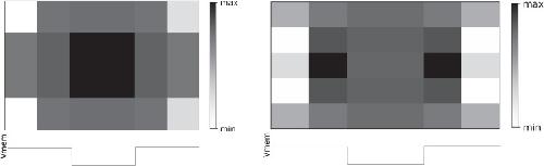 Figure 6. Differential change in model performance due to knocking out individual or patches of cells in the tissueThe darker the shade of a block, the higher the drop in performance due to knocking out that block. A cell or a patch was “knocked out” by freezing the states of its corresponding genes at zero and dropping their biases to negative infinity, thereby rendering them ineffectual both as inputs and outputs.(A) A 4x6 tissue where individual cells were knocked out.(B) A 10x18 tissue where 2-cell x 3-cell patches (each block is a patch) were knocked out. |