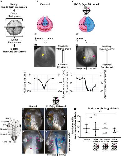 Figure 11. Perturbation of voltage in one-half of an embryo, creating a step function voltage pattern, does not cause defects in brain morphology (A) Illustration of Xenopus embryo at stage 3 (four-cell), indicating two dorsal blastomeres as main precursors of eye and brain and two ventral blastomeres as main precursors of non-neural tissues.137,171 (B) Normal voltage pattern in control (uninjected) stage ∼15 Xenopus embryos. Top: illustration of expected membrane voltage distribution in stage 15 embryo and expected voltage pattern along the dashed line; bottom: representative image of CC2-DMPE:DiBAC voltage-reporter-dyes-stained embryos, showing characteristic hyperpolarization in the neural plate (yellow arrows) and surrounding depolarized ectoderm80,87,88 (N = 6) and quantification of CC2-DMPE:DiBAC4 images along the dashed line indicated in the illustration along with electrophysiology-based membrane voltage approximations. Data are mean+/− SD. (C) Step function voltage pattern at stage ∼15 in embryos microinjected with Kv1.5 + β-galactosidase mRNA in one dorsal blastomere at four-cell stage. Top: illustration of expected membrane voltage distribution in injected stage 15 embryo and expected voltage pattern along the dashed line; bottom: representative image of CC2-DMPE: DiBAC voltage-reporter-dyes-stained embryos, showing characteristic hyperpolarization in neural plate (yellow arrow) but hyperpolarized ectoderm only on the injected side (red arrow) (N = 6) and quantification of CC2-DMPE:DiBAC4 images along the dashed line indicated in the illustration along with electrophysiology-based membrane voltage approximations. Data are mean+/− SD. (D–G) Representative images of stage 45 tadpoles. (D, E) Tadpoles from uninjected (D) or injected (E) embryos. Blue arrowheads indicate intact nostrils, orange brackets indicate intact forebrain (FB), yellow brackets indicate intact midbrain (MB), cyan brackets indicate intact hindbrain (HB) and intact eyes (e) (F, G) β-Galactosidase expression assessed using X-Gal (blue) in bleached tadpoles. In injected tadpoles (G), X-gal staining is evident in the eye and brain on the injected side (blue arrowheads) but not the uninjected side (magenta arrowheads), validating our targeting of mRNA microinjection. There was no X-gal staining (magenta arrowheads) in uninjected tadpoles (F) (N > 10 tadpoles per experimental group). (H) Quantification of brain morphology defects in stage 45 tadpoles under different injection conditions demonstrates no significant differences among any of the injection conditions. All injections were made into the right dorsal blastomere at 4-cell stage as indicated in the schematic under each graph. Percentage of tadpoles with brain defects for each experimental group are as follows: Controls: 8%, β-galactosidase: 7%, Kv1.5 + β-galactosidase: 8%, and Kir4.1: 6%. Data are mean ± SD, n.s. = non-significant (one-way ANOVA with Tukey’s post-hoc test for n = 3 independent experiments with N > 50 embryos per treatment group per experiment). |