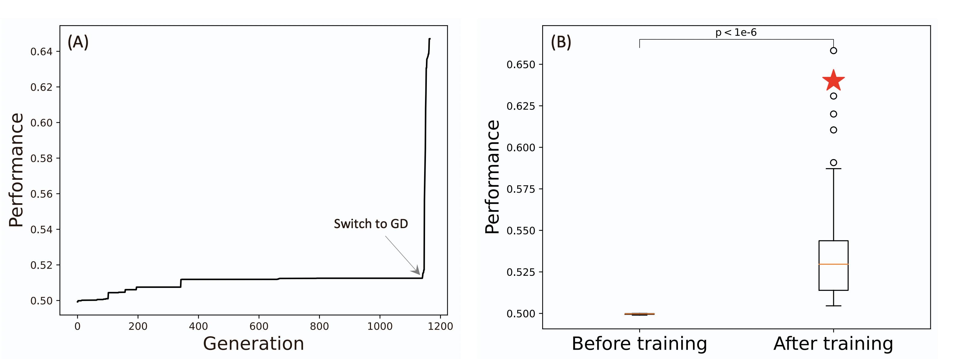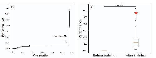 Figure S1. Training improves performance. (A) GA search resulted in a gradual improvement of the performance of the bestperforming individual among the population up until about 1100 generations at which point one of the top two best-performing models was randomly chosen and further refined using GD. (B) Comparison of the performances of an ensemble of models before and after training. The after-training group is significantly better than the before-training group as per t-test (p<1e-6). The red star indicates the performance of the model analyzed in the main text. Related to Figs. 2,3. |
