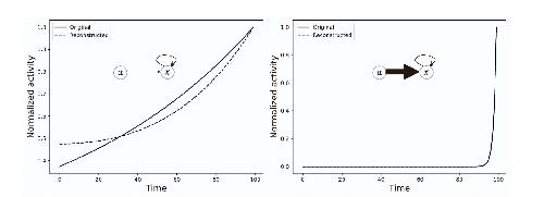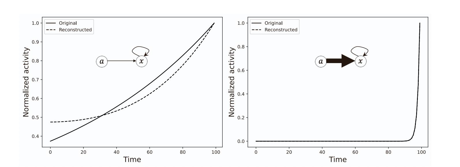 Figure S6. A nonlinear recurrent dynamical system can effectively act like a linear feed-forward-like system when the forcing parameter controls the variable more strongly than the variable does over itself. Shown here are reconstructions of the original observed timeseries (Eqn. 5) using the optimized PTPE approximation (Eqn. 9), where (left) the parameter is small (� = 1); and (right) the parameter is relatively large (� = 10). In the latter case, the parameter effectively canalizes the dynamics of the variable. This is because a canalized system reduces the nonlinearity of the system by partly linearizing it – an effect of the leveraging of timeless Taylor coefficients. Related to Fig. 7. |