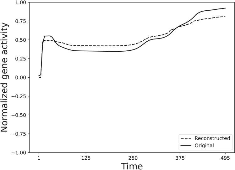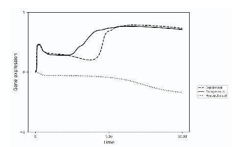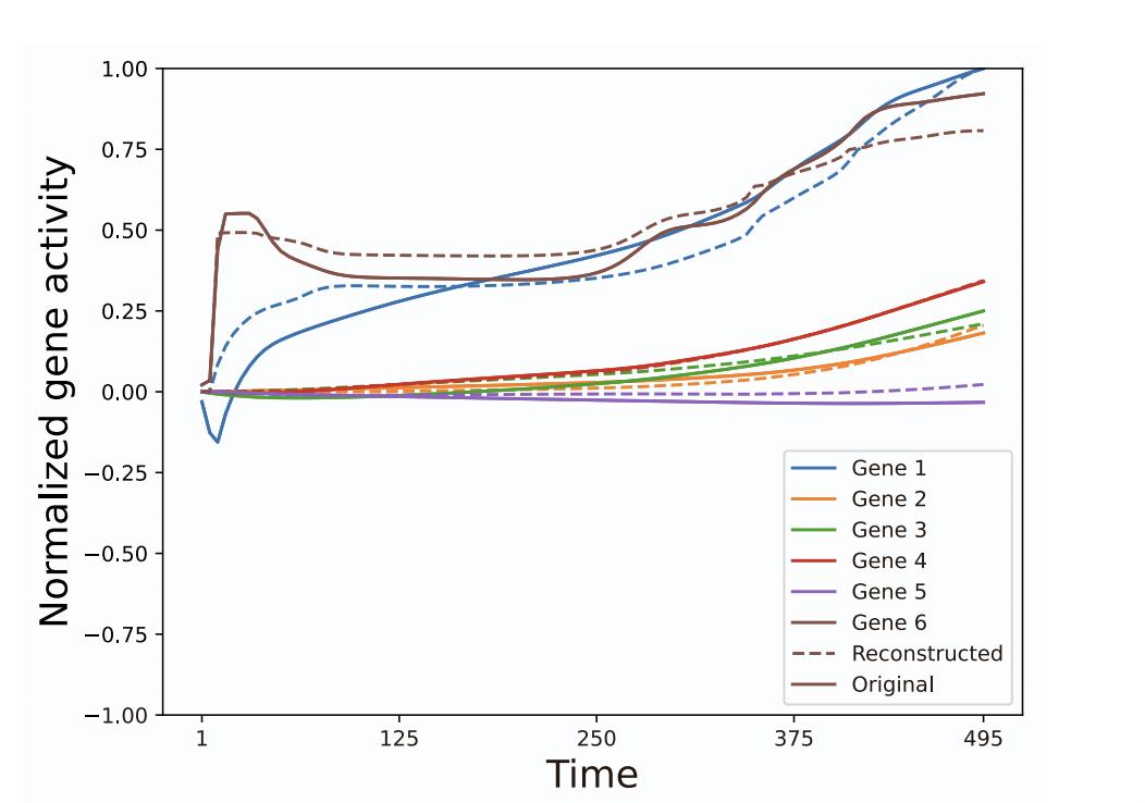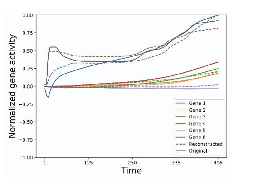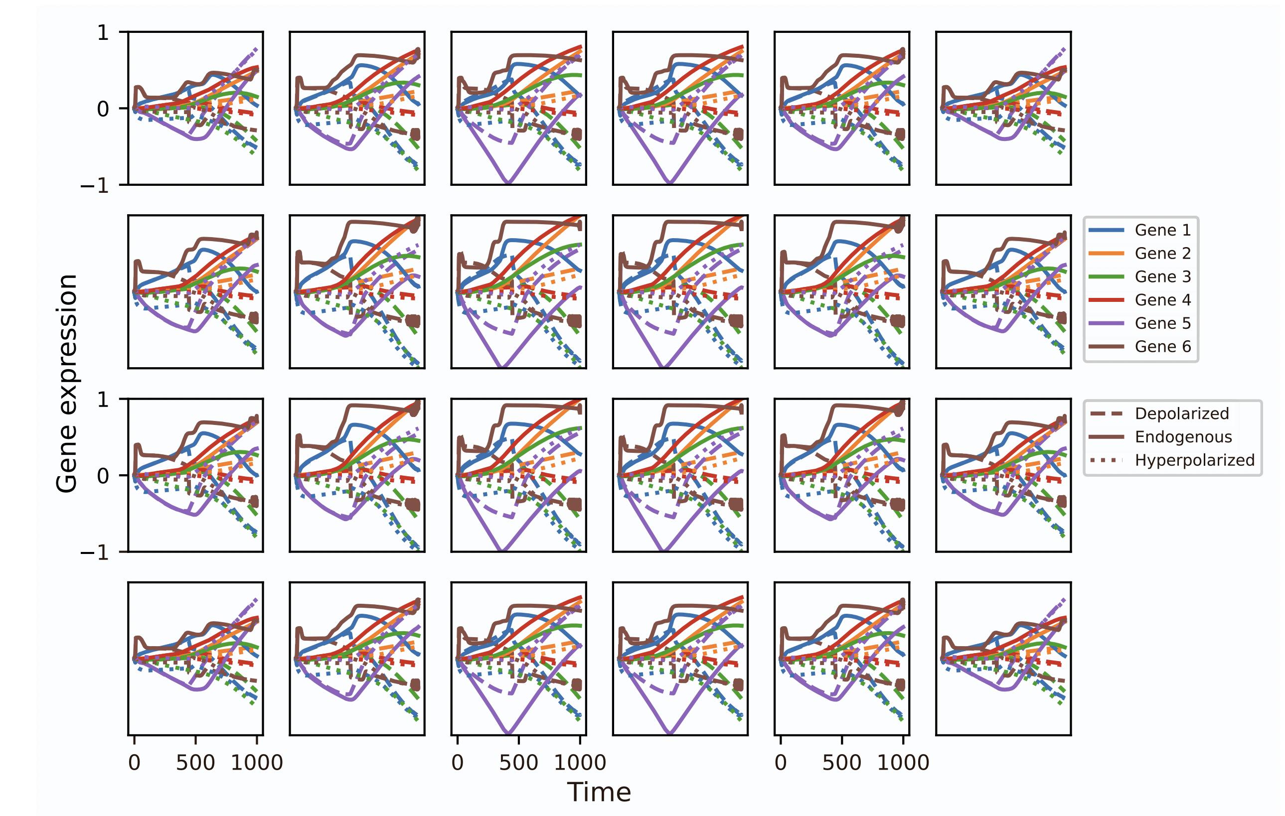 Figure S9. Gene-wise Hessian reconstruction of timeseries. A comparison of the normalized original gene expression timeseries of all the genes (dashed) and the corresponding reconstruction (solid) from the second order (Hessian) influence of the Vmem. The resemblance between the reconstruction and the original indicates that most of the gene activity is determined by its second-order relationship with Vmem. This moreover also suggests a canalization-like mechanism where the dynamics of this complex recurrent model is simplified in such a way that there is an almost direct control of the discriminator gene by the Vmem, as if the paths through the other genes are bypassed; this canalized pathway cannot be inferred from the structure of the static connectivity (Fig 3) alone. This makes intuitive sense since discriminatory behavior requires a comparison of Vmem of different cells, which the Hessian presumably aides by containing the differential information. Due to the symmetry of the model, only the genes contained by the cells in the 2x3 top left quadrant of the full 4x6 tissue (dashed boxes in Fig 9) were considered for these calculations; the Hessian depicted here is the sum of all Hessians corresponding to each cell in the quadrant. Related to Fig. 7. |