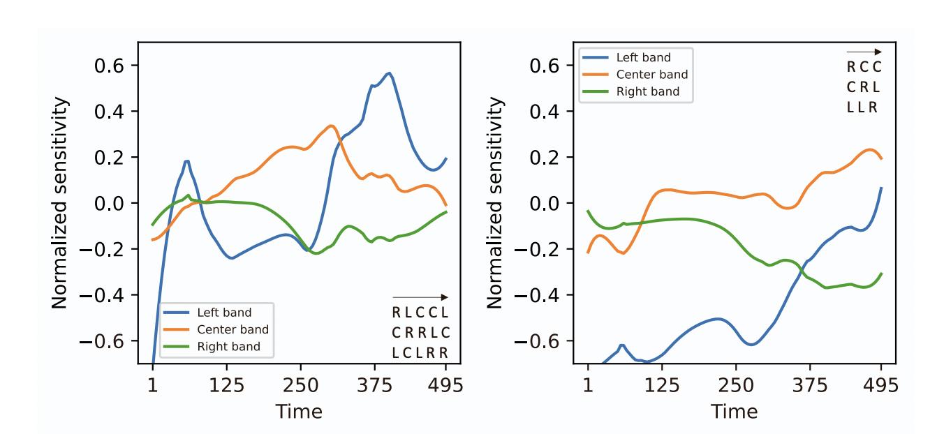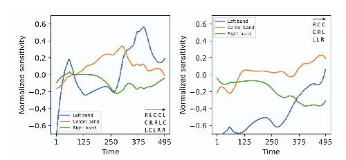 Figure S10. The discriminator gene dynamically processes the three resting potential pattern bands (Figure 1F) in a more complex way (A) compared to the average gene (B). The band-wise first order (Jacobian) normalized sensitivities of gene activity computed with respect to the resting potential pattern bands has a uniquely complex profile for the discriminator gene- gene 6 (A) where the ordering of the bands in terms of their signed sensitivities goes through a slightly more complex sequence (bottom right inset) compared to the average gene (B). From the perspective of minimal cognition, one could conceive this as a form of shifting of “attention”, where attention is constantly shifted from one band to the other so that the corresponding information could be captured and then integrated before settling on a decision. Due to the symmetry of the model, only the cells in the 2x3 top left quadrant of the full 4x6 tissue were considered for these calculations. Related to Fig. 9. |