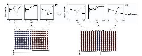 Figure 6. Differential change in model performance due to knocking out individual or patches of cells in the tissue The darker the shade of a block, the higher the drop in performance due to knocking out that block. A cell or a patch was “knocked out” by freezing the states of its corresponding genes at zero and dropping their biases to negative infinity, thereby rendering them ineffectual both as inputs and outputs. (A) A 4x6 tissue where individual cells were knocked out. (B) A 10x18 tissue where 2-cell x 3-cell patches (each block is a patch) were knocked out. |