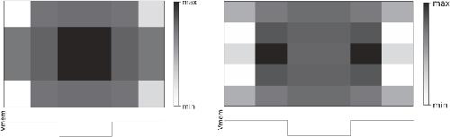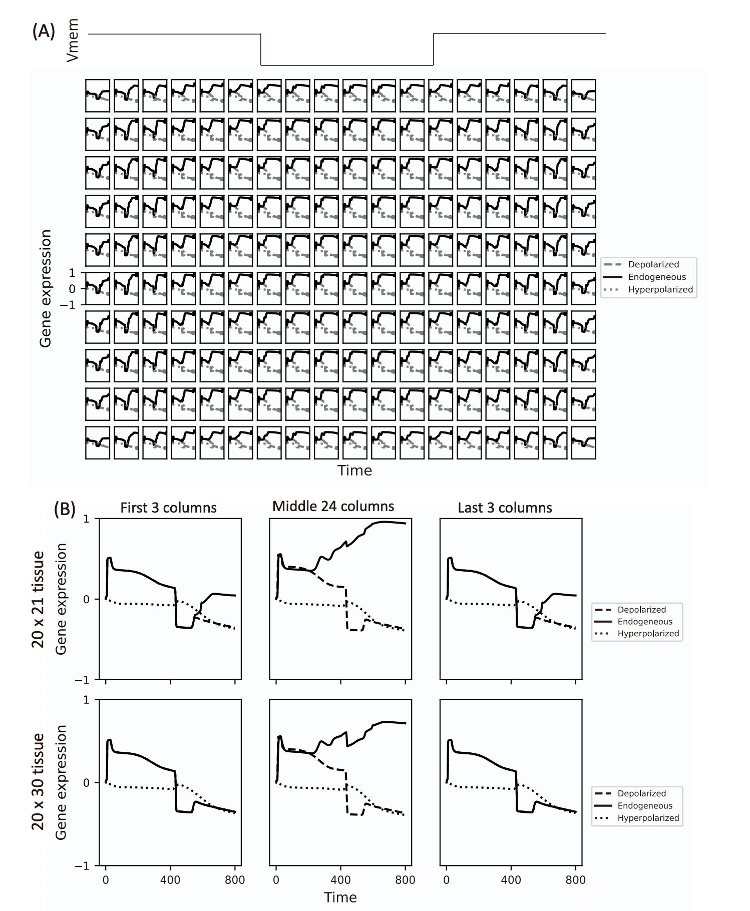 Figure 10. Model predictions about the responses to two types of non-endogenous input voltage patterns with different polarization ratios simulated in a 10x18 tissue Average activity levels of the discriminator gene in response to (A) a voltage pattern with a less skewed ratio of polarization in comparison to the endogenous pattern: a half-and-half (step function) voltage pattern where the left half is hyperpolarized and the right half is depolarized (inset); (B) a voltage pattern with a more skewed ratio of polarization in comparison to the endogenous pattern: a sharpened voltage pattern where the overall pattern is maintained but the hyperpolarized neural plate (central band) is only a third of its original normal size (inset). |