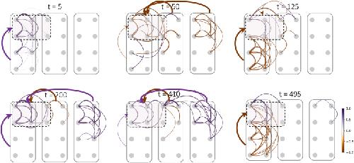 Figure 8. Spatiotemporal dynamics of the second-order control of gene expression by the endogenous voltage patternEach undirected edge represents a pair of cells whose voltages collectively influence the expression of an average discriminator gene in the top left quadrant. The weight of these edges indicates the degree of influence (second-order derivative) exerted by the voltages of the corresponding pairs of cells on the discriminator gene, whereas their colors indicate whether the influence is positive or negative (strong purple means strongly positive and strong orange/brown means strongly negative). These edges represent the summation term in the equation g6(t+1)ˆ=g6(t)ˆ+∑j∈TL∑l=1nc∑k=1nccH[6]∂2g6,j(t)∂Gpl∂Gpk(0), where TL refers to the set of cells in the top left quadrant of the tissue and cH was optimized to fit the observed normalized {g6(t)ˆ} with the initial condition g6(0)ˆ=0. Only the cells in the 2x3 top left quadrant of the full 4x6 tissue (dashed boxes) were considered because the model is bilaterally symmetrical both about the vertical and horizontal axes. For clarity, only about 10% of the observed edges are shown. The arrows running from one band to another serve as a visual illustration of the average weighted and signed influence exerted by the three bands on the target top left quadrant of the pattern. |
