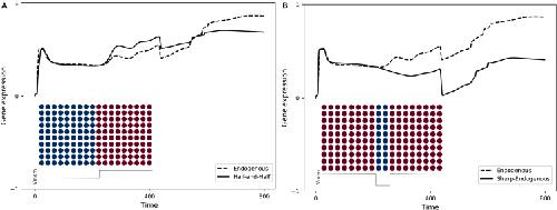 Figure 10. Model predictions about the responses to two types of non-endogenous input voltage patterns with different polarization ratios simulated in a 10x18 tissueAverage activity levels of the discriminator gene in response to (A) a voltage pattern with a less skewed ratio of polarization in comparison to the endogenous pattern: a half-and-half (step function) voltage pattern where the left half is hyperpolarized and the right half is depolarized (inset); (B) a voltage pattern with a more skewed ratio of polarization in comparison to the endogenous pattern: a sharpened voltage pattern where the overall pattern is maintained but the hyperpolarized neural plate (central band) is only a third of its original normal size (inset). |
