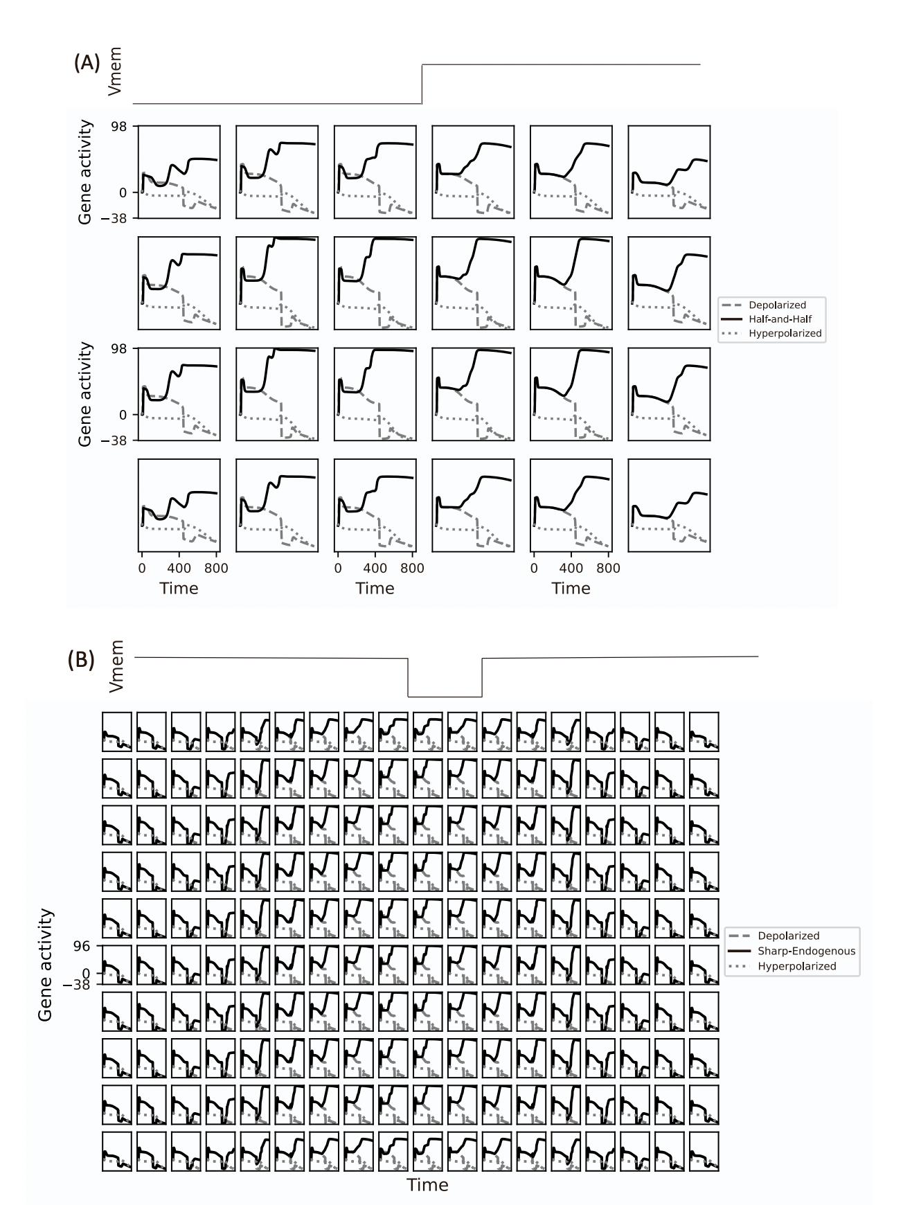 Figure S14. A more nuanced analysis of the gene activities for the half-and-half and the sharp-endogenous patterns. Panels display gene expression timeseries averaged over the cells in the first 3 columns, the middle 12 columns and the last 3 columns. (A) Response to a voltage pattern with a less skewed ratio of polarization: a half-and-half (step function) voltage pattern where the left half is hyperpolarized, and the right half is depolarized (inset) should result in normal brain development as indicated by the mean gene expression of the discriminator gene, averaged over all cells, discriminating it from the other patterns. (B) Response to a voltage pattern with a more skewed ratio of polarization: a sharpened voltage pattern where the overall pattern is maintained but the hyperpolarized neural plate (central band) is only a third of its original normal size (bottom panel: only the middle two columns are depolarized). Related to Fig. 10. |