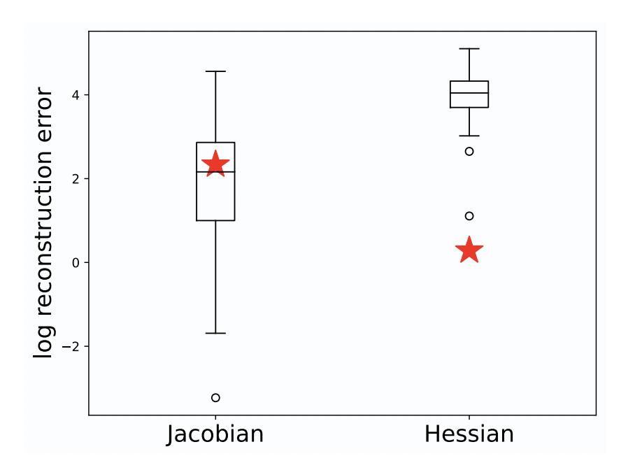 Figure S8. The distributions of reconstruction errors, plotted on a log scale, for a suite of 100 randomly parametrized neural plate models obtained by individually optimizing the coefficients of the Jacobian and the Hessian terms. Red stars indicate the corresponding errors for the trained neural plate model described and analyzed in the main text. These plots show that though good fits may be expected with just the Jacobian (5-percentile MSE as low as 0.07), the Jacobian reconstruction MSE of our neural plate model is about 0.14 and is well placed within the expected range of 5 and 95 percentiles. The Hessian reconstruction errors, on the other hand, are higher than the corresponding Jacobian errors (5-percentile MSE is about 4.8). Although, the Hessian error of our neural plate, with an MSE of 0.23, is well below the expected range. These observations suggest that the neural plate model was optimized to operate at the second-order level. Related to Fig. 7. |