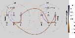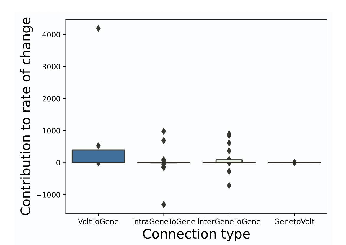 Figure 3. Architecture of the chosen high-performing model Depicted here is the connectivity of a two-cell version of the full model; the rest of the network is symmetrical to this version (full model parameters described in Tables S1–S8). For clarity, we show only about 20% of the strongest connections (10% of the most positive in purple and 10% of the most negative in orange/brown); edge weights are linearly normalized to the range (−1, 1). The most prominent connections run from the voltage to gene 5 (purple), with a positive weight, and among genes 3 and 5 both within a cell and between cells (brown), with a negative weight. Connections running from genes to voltage do exist in the full model, but they were filtered out due to their weak weights. |