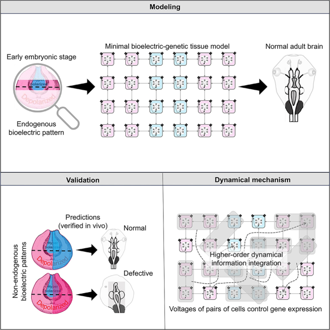 Spatiotemporal patterns of cellular resting potential regulate several aspects of development. One key aspect of the bioelectric code is that transcriptional and morphogenetic states are determined not by local, single-cell, voltage levels but by specific distributions of voltage across cell sheets. We constructed and analyzed a minimal dynamical model of collective gene expression in cells based on inputs of multicellular voltage patterns. Causal integration analysis revealed a higher-order mechanism by which information about the voltage pattern was spatiotemporally integrated into gene activity, as well as a division of labor among and between the bioelectric and genetic components. We tested and confirmed predictions of this model in a system in which bioelectric control of morphogenesis regulates gene expression and organogenesis: the embryonic brain of the frog Xenopus laevis. This study demonstrates that machine learning and computational integration approaches can advance our understanding of the information-processing underlying morphogenetic decision-making, with a potential for other applications in developmental biology and regenerative medicine.