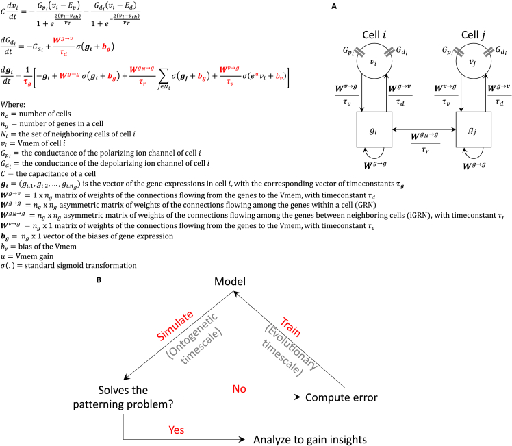Figure 2. Overview of the mathematical details of the neural plate circuit model and the process of identifying its parameters (training)(A) The equations defining the model, with the variables and parameters mapped to a simplified two-cell version (the rest of the model is symmetrical to this version). The parameters (red) are learned using machine-learning techniques. The bioelectric constants, namely, C, vth, v0, and vT, are described in ref.88 and in Tables S1–S8.(B) The model is trained using a combination of genetic algorithm and gradient descent. The final model referred to throughout this paper is a product of a training loop that starts with a population of randomly parametrized models, simulates all of them, and then modifies them using genetic algorithm and gradient descent to improve their ability to solve the pattern discrimination problem. |