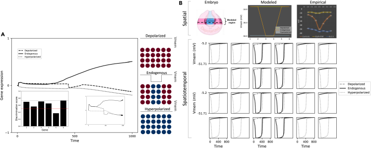 Figure 4. The model not only discriminates between the correct and the incorrect voltage patterns by mapping them to distinct gene expression values but also recapitulates empirically observed development of the voltage pattern (A) Timeseries of the mean normalized gene expression, averaged over all cells and genes, for the three different input conditions depicted on the right: “Depolarized” (all cells are initially depolarized), “Endogenous” (the left and right two columns are initially depolarized with the middle two columns hyperpolarized), or “Hyperpolarized” (all cells are initially hyperpolarized). Insets: (left) discrimination scores of the six individual genes. The red dashed horizontal line indicates the discrimination score expected from a randomly parametrized model. (Right) Gene expression timeseries for gene 6, the gene with the highest discrimination score; the scales of the axes match the scales of the main plot. More detailed timeseries resolved at the level of cells and genes are presented in Figure S2. (B) Top: comparison of the modeled and empirical spatial voltage profiles of a horizontal cross-section of the embryo (schematic) at a point in time when the voltages corresponding to the three different input conditions (treatments) have fully developed (∼200th timestep in the model). Bottom: the spatiotemporal voltage profile of the model depicting the timeseries of Vmem for each cell under each of the three input conditions. Each square in the 4x6 layout of the tissue refers to an individual cell. |