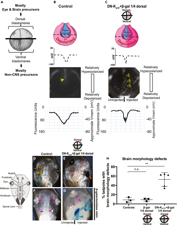 Figure 12. Perturbation of voltage to decrease neural plate hyperpolarized cells while minimally changing the overall voltage pattern leads to significant brain morphology defects(A) Illustration of Xenopus embryo at stage 3 (four-cell) indicating two dorsal blastomeres as main precursors of eye and brain and two ventral blastomeres as main precursors of non-neural tissues.137,171(B) Endogenous voltage pattern in control (uninjected) stage ∼15 embryos. Top: illustration of expected membrane voltage distribution in stage 15 embryo and expected voltage pattern along the dashed line; bottom: representative image of embryo stained with CC2-DMPE:DiBAC4 voltage reporter dyes, showing characteristic hyperpolarization in the neural plate (yellow arrows) and surrounding depolarized ectoderm80,87,88 (N = 6) and quantification of CC2-DMPE:DiBAC4 images along the dashed line indicated in the illustration along with electrophysiology-based membrane voltage approximations. Data are mean+/− SD.(C) Altered voltage pattern in stage ∼15 embryos microinjected with DN-KATP+ β-galactosidase mRNA in one dorsal blastomere at four-cell stage. Top: illustration of expected membrane voltage distribution in injected stage 15 embryo and expected voltage pattern along the dashed line; bottom: representative image of injected embryo stained with CC2-DMPE: DiBAC4 membrane voltage reporter dyes showing reduced region of hyperpolarization in neural plate and narrower hyperpolarization region (empty yellow arrow) (N > 6 embryos per experimental group) and quantification of CC2-DMPE:DiBAC4 images along the dashed line indicated in the illustration along with electrophysiology-based membrane voltage approximations. Data are mean+/− SD.(D–G) Representative images of stage 45 tadpoles. (D, E) Tadpoles from uninjected (D) or microinjected with DN-KATP+ β-galactosidase mRNA (E) embryos. Blue arrowheads indicate intact nostrils; orange, yellow, and cyan brackets indicate intact forebrain (FB), midbrain (MB), and hindbrain (HB), respectively. (e) indicates intact eyes, and orange arrowheads indicate mispatterned brain and eye. (F, G) β-Galactosidase expression assessed using X-Gal (blue) in bleached tadpoles either left uninjected (controls) or co-injected with DN-KATP+ β-galactosidase mRNA. There was no X-gal staining (magenta arrowheads) in uninjected tadpoles (F) In injected tadpoles (G), β-galactosidase was observed in the eye and brain on the injected side (blue arrowheads) but not the uninjected side (magenta arrowheads), confirming expected targeting of microinjected mRNAs. (N > 10 tadpoles per experimental group).(H) DN-KATP + β-galactosidase injection significantly increased the percentage of stage 45 tadpoles with brain morphology defects: uninjected or β-galactosidase controls—both 9%; DN-KATP + β-galactosidase—53%. All injections were made into the right dorsal blastomere at four-cell stage as indicated in the schematic under each graph. Data are mean ± SD, ∗∗p < 0.01, n.s. = non-significant (one-way ANOVA with Tukey’s post-hoc test for n = 3 independent experiments with N > 50 embryos per treatment group per experiment). |