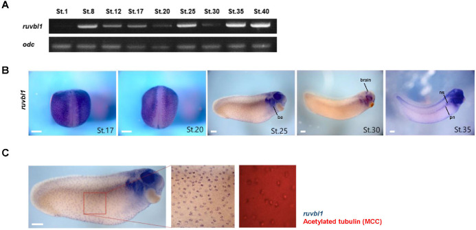 Xenopus laevis embryogenesis.(A) Temporal expression patterns by RT-PCR. Ruvbl1 is