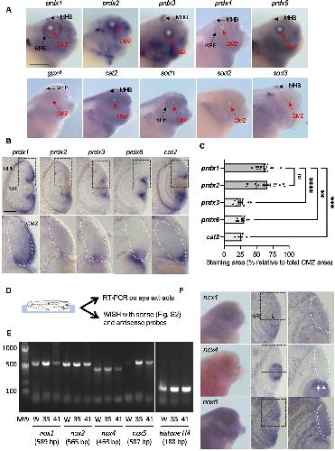 Fig. 2 Redox gene expression in RSCs. (A-C) Whole-mount in situ hybridization analysis of prdx1/2/3/4/6, gpx4, cat2 and sod1/2/3 expression (stage 38/39 embryos). (A) Lateral views of the head. (B) Representative retinal sections, with higher magnification views of the dorsal CMZ (delineated in white). (C) Staining extension (peripheral to central), determined as the ratio between the stained surface and total CMZ area. Note that only the dorsal CMZ was considered, as at this embryonic stage the ventral part is not fully mature, causing retinal stem/progenitor markers to be expressed in a broader domain. n=7-18 vibratome sections (from 8-10 embryos) per probe. Statistics: Kruskal–Wallis test followed by uncorrected Dunn's test (ns, not significant). (D-F) Analysis of NOX gene expression by RT-PCR (E) or whole-mount in situ hybridization (WISH) (F). (E) NOX gene expression was assayed in either embryonic (stage 35) or post-embryonic (stage 41) eye extracts, or in stage 35 whole embryo extracts (W). MW, molecular weight. Amplification of histone H4 was used as a loading control. (F) Lateral views of the head and representative retinal sections of stage 38/39 embryos, with higher magnification views of the dorsal CMZ (delineated in white). White arrows point to lens precursor cells. L, lens; MHB, midbrain-hindbrain boundary; NR, neural retina; RPE, retinal pigmented epithelium. Scale bars: 500 µm (lateral views of the head); 50 µm (retinal sections).