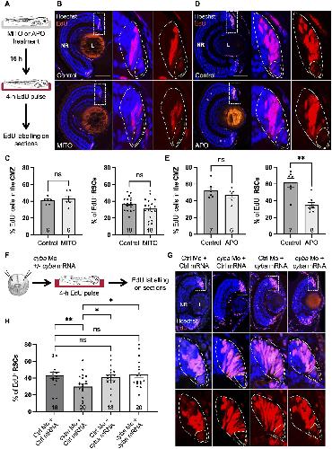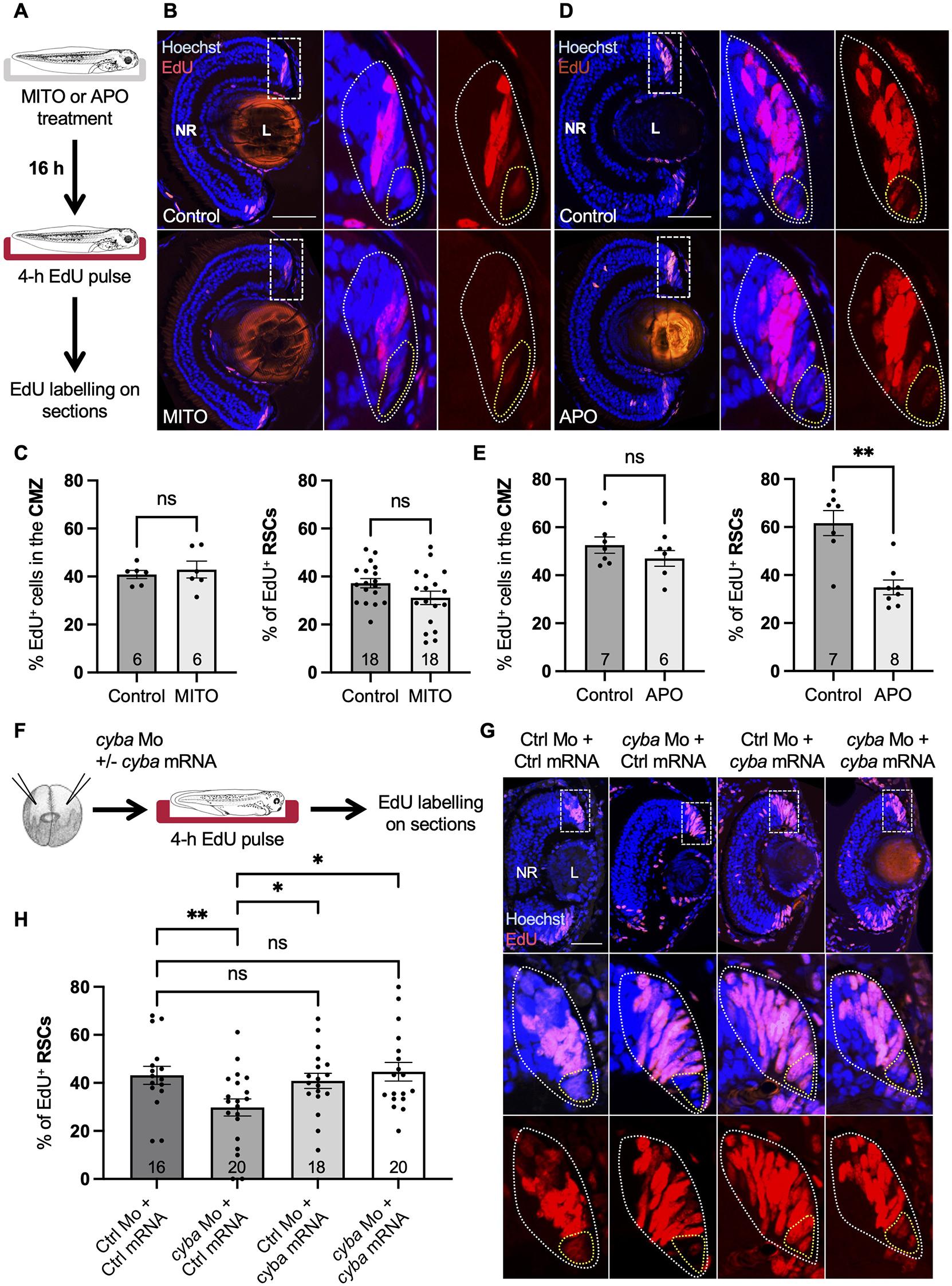 Fig. 3 Impaired RSC proliferation upon NOX inhibition. (A-E) Tadpoles were treated for 16 h with MITO (stage 43; B,C) or APO (stage 41; D,E) and subjected to a 4-h EdU pulse. (B-E) Representative images of retinal sections and corresponding quantification. (F-H) Stage 37/38 embryos were subjected to a 4-h EdU pulse, following co-injection at the two-cell stage of control (Ctrl) or cyba morpholinos (Mo), together with either control or cyba mRNA (rescue construct insensitive to the morpholino). (G,H) Representative images of retinal sections and corresponding quantification. In H, quantification was restricted to the dorsal CMZ, due to ventral defects of the retina. Right panels in B,D or lower panels in G are higher magnifications of the dorsal CMZ (delineated in white). RSCs are delineated in yellow. The number of analysed retinas are given at the base of each bar. Statistics: Mann–Whitney test (C,E) or Kruskal–Wallis test followed by uncorrected Dunn's test (H) (ns, not significant). L, lens; NR, neural retina. Scale bars: 50 µm.