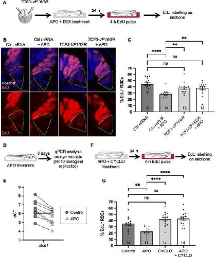 Fig. 8 Functional interaction between NOX, Wnt and Hedgehog signalling. (A-C) Two-cell-stage embryos were injected with control (Ctrl) or TCF3-VP16GR mRNA. At stage 37/38, they were treated with APO and dexamethasone (DEX; to induce TCF3-VP16GR activity) for 24 h. They were then subjected to a 4-h EdU pulse. (B) Representative images of the dorsal CMZ (RSCs delineated in yellow). (C) Corresponding quantification. (D,E) qPCR analysis of patched 1 (ptch1) expression on eye extracts from stage 42/43 tadpoles treated for 3 days with APO. (F,G) Stage 37/38 embryos were treated for 24 h with APO, cyclopamine (CYCLO) or both, and then subjected to a 4-h EdU pulse. (G) Corresponding quantification. The number of analysed retinas in C,G is given at the base of each bar. Statistics: Kruskal–Wallis test followed by uncorrected Dunn's test (C,G) or Wilcoxon matched-pairs signed rank test (E) (ns, not significant). Scale bar: 25 µm.