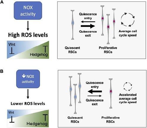 Fig. 9 Model illustrating NOX signalling function in post-embryonic RCSs. (A) In the RSC niche, NOX-dependent control of the Wnt/Hedgehog balance results in a low level of quiescence. Activated RSCs proliferate slowly. (B) Upon NOX inhibition, the activity of Wnt signalling drops, and that of the Hedgehog pathway increases. As a consequence, more RSCs are pushed towards quiescence. This is associated with an apparent increase of the mean cell cycle speed within the cell fraction that still proliferates.