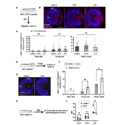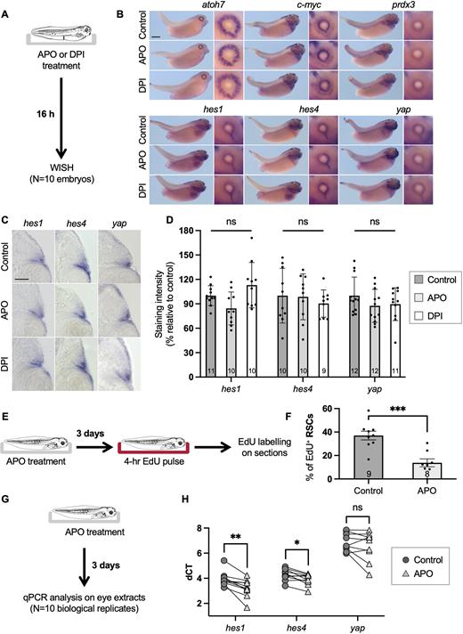 Fig. 4 RSC marker expression upon NOX inhibition. (A-D) Stage 40 embryos were treated for 16 h with APO or DPI. They were then subjected to whole-mount in situ hybridization (WISH) analysis of RSC (myc, prdx3, hes1, hes4, yap) or progenitor (atoh7) marker expression. (B) In toto lateral views, with higher magnification views of one eye. (C,D) Representative retinal sections (high magnifications of the dorsal CMZ) and corresponding quantification. (E-H) Analysis of RSC proliferation (E,F; 4-h EdU pulse) and RSC marker expression (G,H; qPCR on eye extracts) following a 3-day treatment with APO at stage 42/43. Statistics: Kruskal–Wallis test (D), Mann–Whitney test (F) or Wilcoxon matched-pairs signed rank test (H) (ns, not significant). The number of analysed retinas in D,F is given at the base of each bar. Scale bars: 1 mm (B); 25 µm (C).