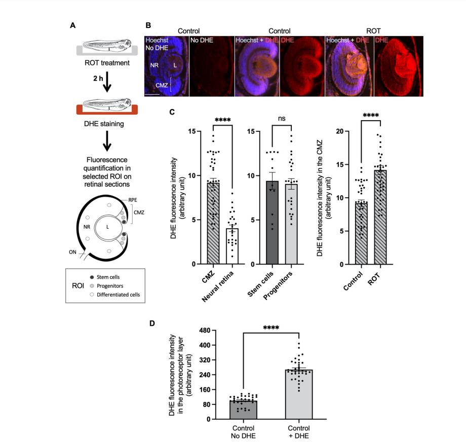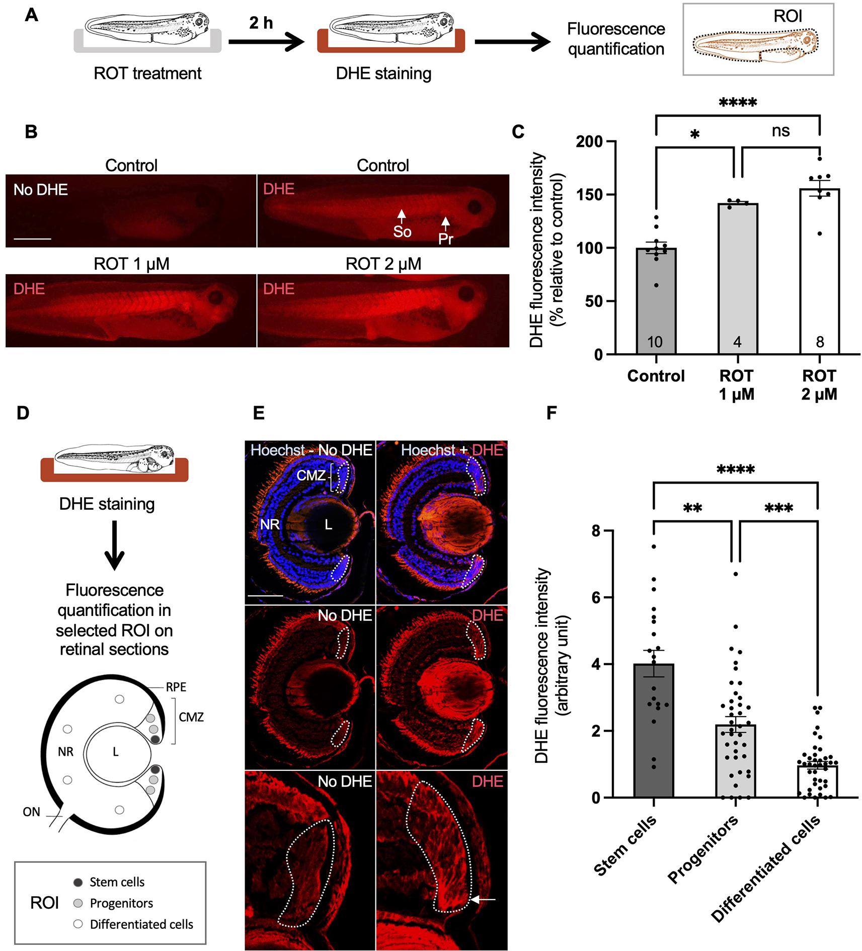 Fig. 1 Redox status of post-embryonic RSCs. (A-C) Stage 39/40 control and rotenone (ROT)-treated tadpoles were labelled (or not) for ROS content with the fluorescent sensor dihydroethidium (DHE/no DHE). DHE intensity was quantified in the whole body (delineated in black in A). The vitellus was excluded because of its auto-fluorescence. (B,C) Representative images and quantifications. The number of analysed tadpoles is given at the base of each bar. (D-F) Stage 42/43 tadpoles, stained (or not) with DHE, were processed for analysis on retinal sections. Circles in the retina schematic indicate the ten regions of interest (ROI) where DHE staining intensity was measured on each section. Dark and light grey circles are located in the stem cell and progenitor regions of the CMZ, respectively. White circles are located within the neural retina, where cells are differentiated. (E) Representative retinal sections, with higher magnification views of the dorsal CMZ (delineated in white). The white arrow points to RSCs. Note that, in addition to the CMZ, strong DHE staining is detected in photoreceptor outer segments (significantly higher intensity compared with the ‘no DHE’ condition where only auto-fluorescence is observed; Fig. S1D). The lens likely exhibits high ROS levels as well. (F) Corresponding quantification. n=10 sections per condition. Statistics: Kruskal–Wallis test followed by uncorrected Dunn's test (ns, not significant). L, lens; NR, neural retina; ON, optic nerve; Pr, pronephros; RPE, retinal pigmented epithelium; So, somites. Scale bars: 1 mm (B); 50 µm (E).