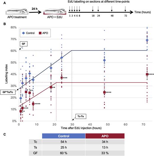 Fig. 6 Enhanced cell cycle kinetics of RSCs upon NOX inhibition. (A) Stage 41/42 tadpoles were treated with APO for 24 h before addition of EdU to the rearing medium. They were then processed for EdU cumulative labelling at different time points, as indicated. APO and EdU were renewed daily. (B) Quantification of the EdU cumulative labelling index within RSCs, along with increasing EdU exposure times. The graph was made using the TcFit spreadsheet developed by R. Nowakowski (Nowakowski et al., 1989), which allows the best-fit line to be determined and GF (growth fraction), TC (total cell cycle length) and TS (S-phase length) to be calculated. Small squares and diamonds correspond to individual retinas and large ones represent the mean. n=10-20 analysed retinas at each time point, for each condition. Statistics: Mann–Whitney test. (C) Estimation of GF, TC and TS.