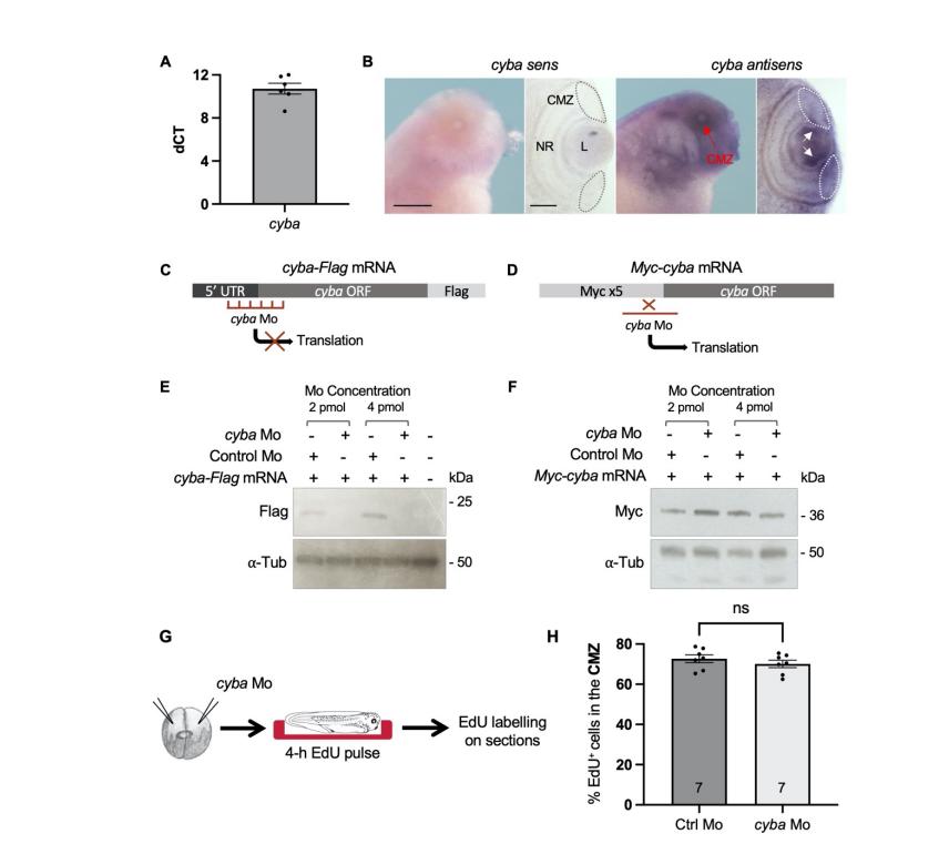 37/38 embryos were subjected to a 4-hour EdU pulse, following injection at the twocell stage of control (Ctrl) or cyba Morpholinos (Mo). Shown in (H) is the