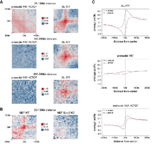 Figure 5. Addition of recombinant CTCF to Xenopus pronuclei fails to induce typical corner peak or TAD formation but generates weak contacts between Smc3 sites at very small distances. (A) Log2 of observed/control of aggregate contact frequencies between consecutive, directly adjacent Smc3 binding sites with a distance between the binding sites as indicated and 5-kb bin size, for demembranated frog sperm in Xenopus egg extract after 140 min (pronuclei 140′), pronuclei 140′ with addition of 50 nM CTCF protein, and frog XL-177 cells. To calculate control values, Smc3 binding sites were shifted by 10 Mb. (B) Log2 of observed/control of aggregate contact frequencies for mouse WT MEF cells and Smc3 KO MEF cells between consecutive, directly adjacent Smc3 binding sites in WT MEF cells with a distance between the binding sites of 25–100 kb and 5-kb bin size. Hi-C data by Banigan et al. (2023); ChIP-seq data from this study. To calculate control values, Smc3 binding sites were shifted by 10 Mb. (C) Average profiles of the directionality index for XL-177 cells, pronuclei 140′, and pronuclei 140′ with addition of 50 nM CTCF protein over unambiguously oriented CTCF binding sites detected in pronuclei 140′ +CTCF.