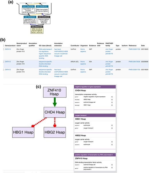 Fig. 1. Examples of the three components of the GO knowledgebase. a) The GO ontology consists of terms, e.g. DNA binding transcription factor activity, and relationships between the terms (arrows; black = is a, blue = part of, and orange = regulates). b) GO annotations associate a specific gene product (here, human ZNF410) with GO terms asserting its functional aspects (“GO Class” column, e.g. sequence-specific double-stranded DNA binding) and the evidence for each assertion with its traceable source (“Evidence” and “Reference” columns). c) The GO-CAM model combines individual GO annotations into a model, in this case a very simple model describing how human ZNF410 acts as a transcription factor to positively regulate (denoted by the arrow) transcription of the CHD4 gene, which in turn acts as a corepressor to repress (denoted by dashed lines) transcription of fetal hemoglobin genes (HBG1 and HBG2) in erythroid lineage cells. In this view, each box in the GO-CAM is labeled with the gene product and species abbreviation for simplicity. |