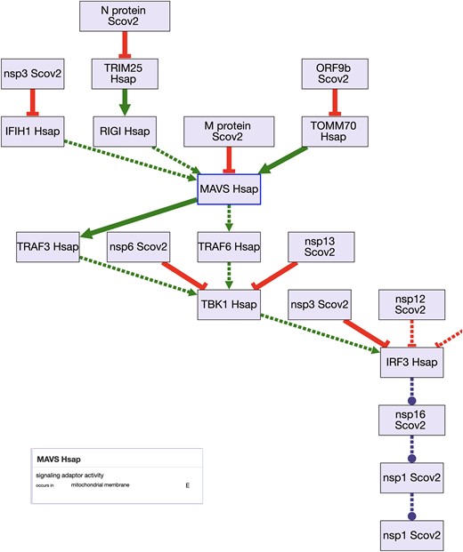 Fig. 2. GO-CAM model of the SARS-CoV2—host interactions as displayed using the GO-CAM Pathway Widget (code available at https://github.com/geneontology/wc-gocam-viz) on the Alliance of Genome Resources gene pages (https://www.alliancegenome.org/gene/HGNC:20144#pathways). The model includes proteins from both humans (Hsap) and the SARS-CoV-2 virus (Scov2). A simplified representation of the causal model is shown on the main figure, which is simplified by labeling each activity with the gene and organism. The model includes many additional details, which are displayed as “cards;” the information for MAVS activity (inset) which normally acts as a signaling adaptor located in the mitochondrial membrane. MAVS activity is suppressed directly by the SARS-CoV-2M protein and indirectly by other SARS-CoV-2 proteins. Each of the “E” symbols on the right-hand side can be clicked to see the evidence for each assertion in the model. |