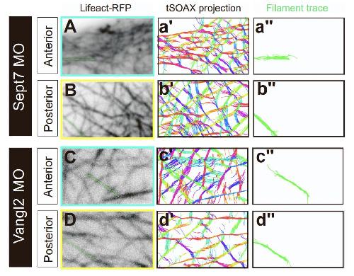 Septin7MO or Vangl2MO cells as indicated. a’-d’. tSOAX segmentation. a”-d”. Representative