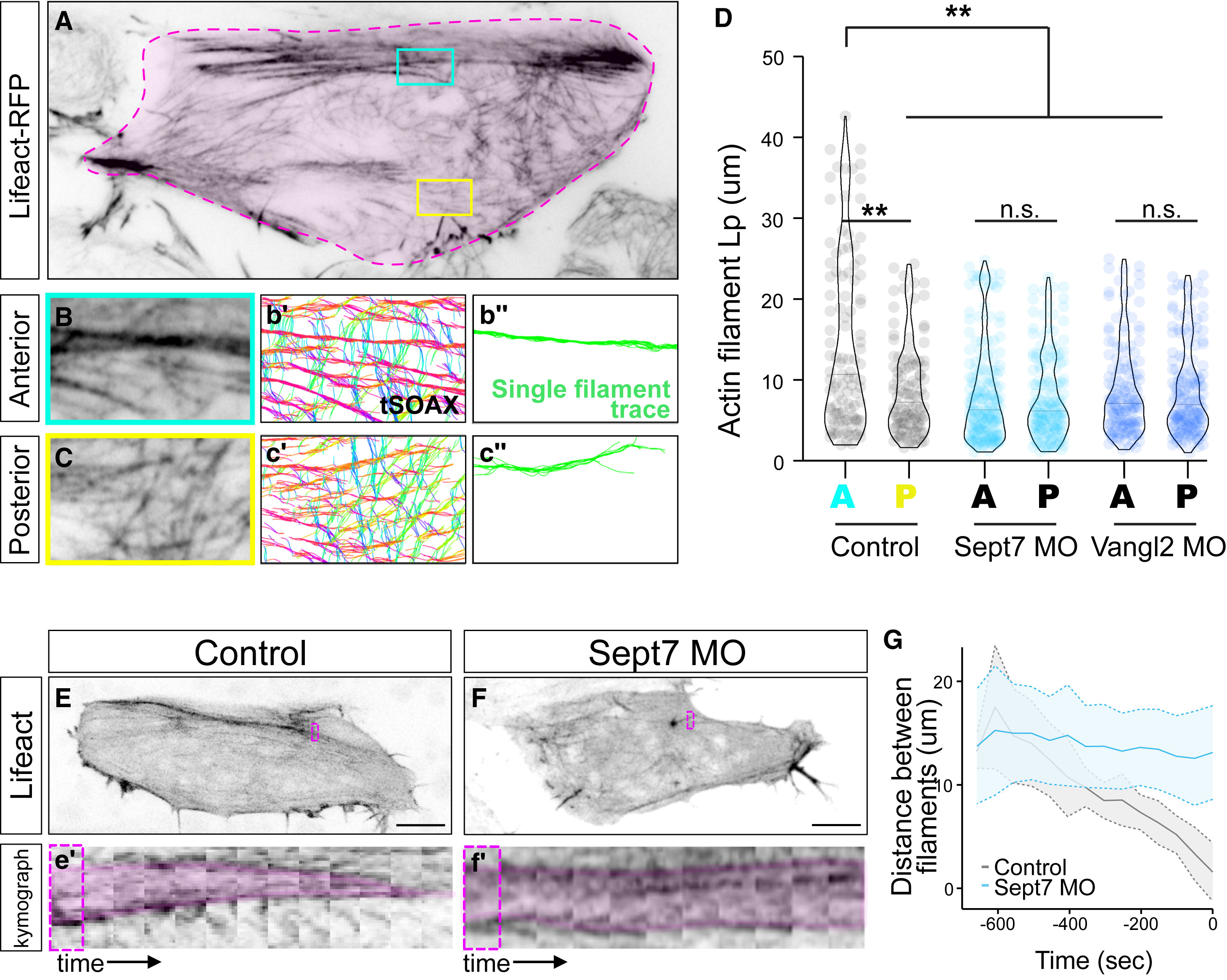 (D) Quantification of persistence length (Lp) of actin filaments in anterior (A) or posterior (P) cellular regions of control, Sept7MO, and Vangl2MO cells.