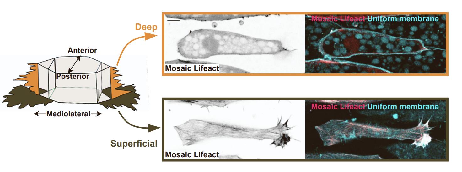 labelled, brown and orange structures represent mediolaterally oriented lamellipodia at the