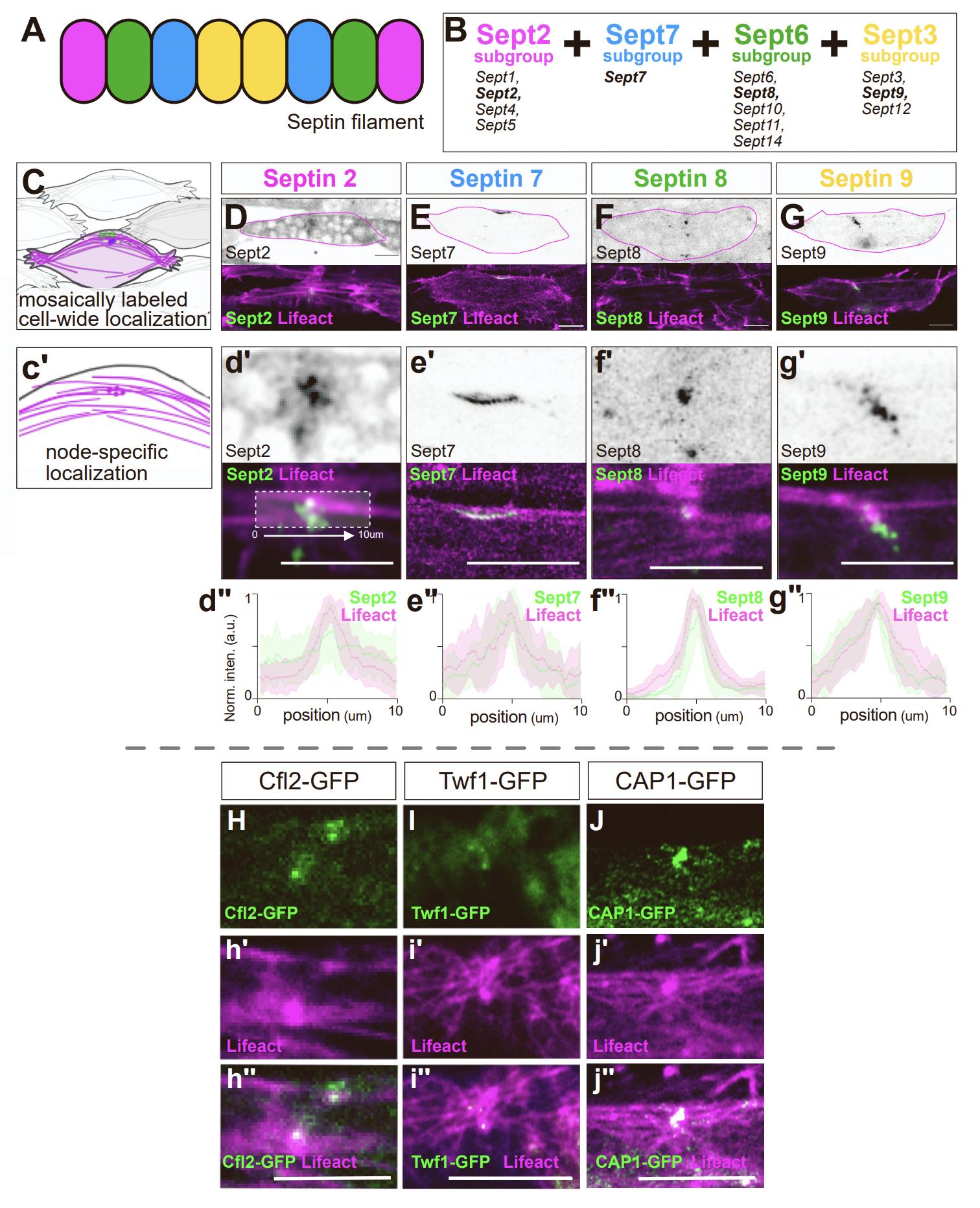 (I–L) Images of indicated Septin subunits (green) and Lifeact (magenta) at nodes; scale bars, 10 μm.