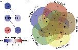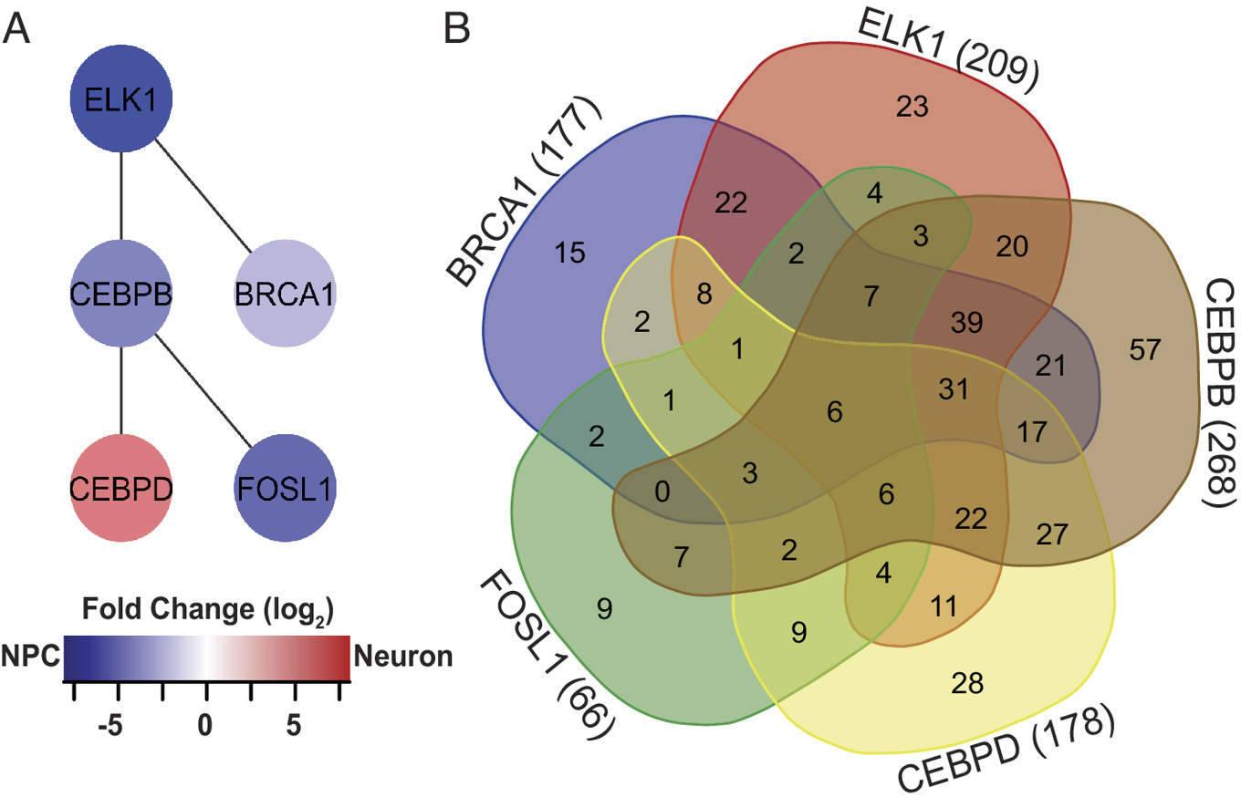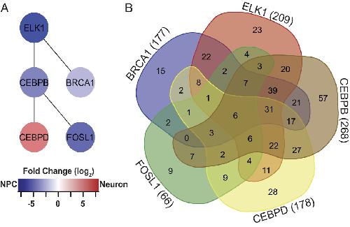 Fig. 3. Network of differentially expressed transcriptional regulators. (A) ELK1, BRCA1, CEBPB, CEBPD, and FOSL1 form a network of DE transcription factors that regulates other DE transcription factors. Color refers to fold change enrichment between NPCs (blue) and neurons (red). (B) 5-way Venn diagram showing the numbers of transcripts targeted by the 5 DE transcription factors in (B). For specific targets, see SI Appendix, Table S3.