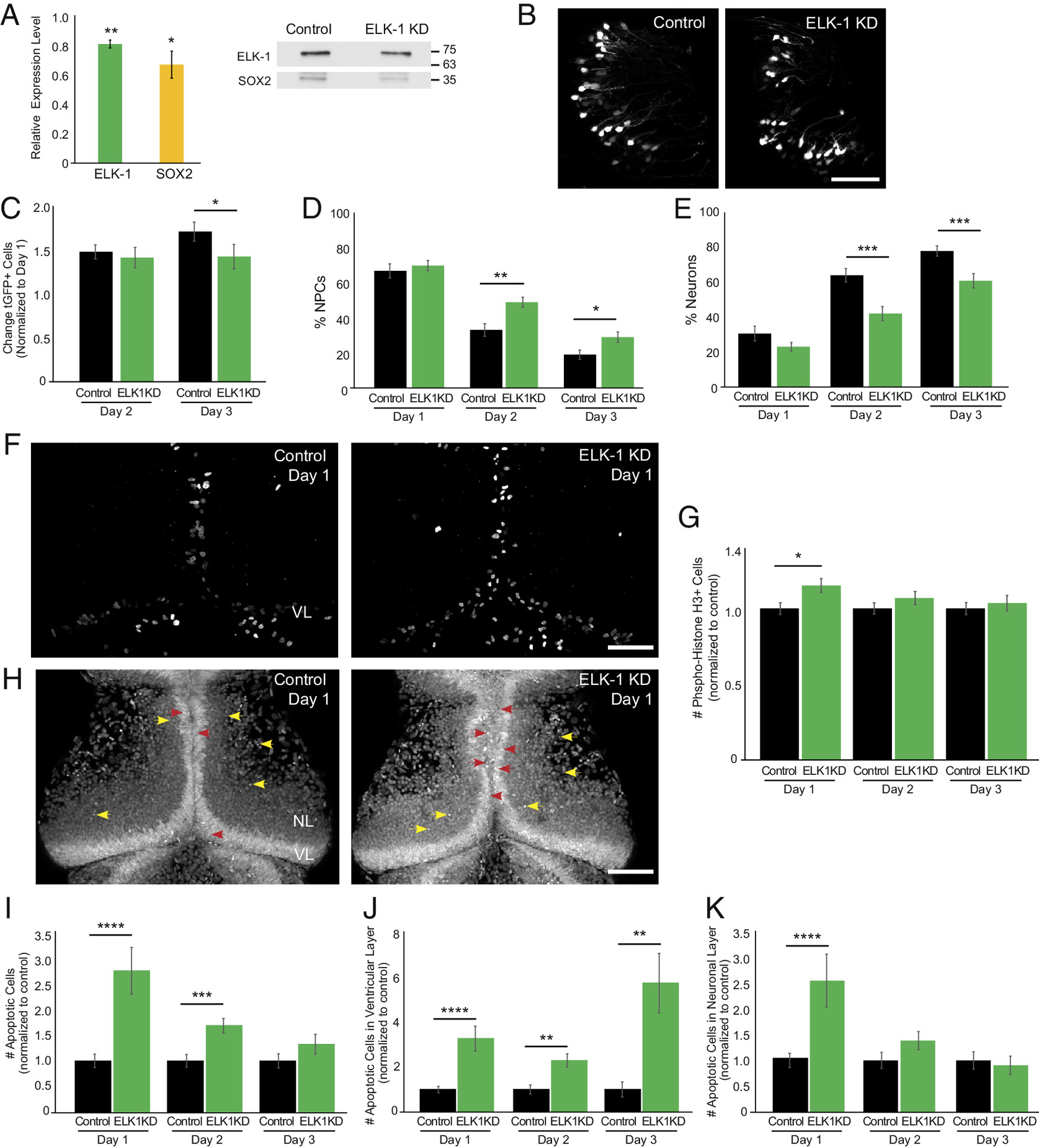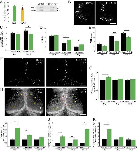 ELK-1 regulates neural progenitor cell fate. (A) elk-1 morpholino reduces ELK-1 (green, n = 3) and SOX2 (yellow, n = 3) compared to control morpholino-treated animals. Midbrains were dissected for western blots 2 d after electroporating morpholinos. Blots were normalized to Ponceau staining for quantification. (B) Representative in vivo images of tGFP+ cells in the optic tectum from control morpholino-treated animals and ELK-1 KD animals. The experimental protocol is shown in Fig. 4C. (Scale bar: 100 µm.) (C) ELK-1 KD significantly reduces the total number of tGFP+ progeny number on day 3 compared to control morpholino-treated animals. n = 12 animals per condition. (D and E) ELK-1 KD significantly increases the percentage of NPCs (D) and decreases neurons (E) in total eGFP+ cells compared to control morpholino-treated animals. (F) Confocal Z-projection of phospho-Histone H3 (pH3) immunolabeling in control morpholino-treated animals and ELK-1 KD tecta. (Scale bar: 100 µm.) (G) ELK-1 KD increases pH3+ cells on day 1 compared to control morpholino-treated animals. n = 40 to 52 animals per group/timepoint. (H) Confocal Z-projection images of SYTOX+ apoptotic nuclei in NPCs in the ventricular layer (VL) on day 1 (red arrowheads) and apoptotic neurons in the neuronal layers (NL, yellow arrowheads). (Scale bar: 100 µm.) (I) ELK-1 KD significantly increases the total number of apoptotic cells on days 1 and 2 compared to control morpholino-treated animals. n = 39 to 51 animals per group/timepoint. (J and K) ELK-1 KD significantly increased apoptosis in NPCs across all days tested (J) and in neurons on day 1 (K) compared to control morpholino-treated animals. *P < 0.05, **P < 0.01, ***P < 0.001, and ****P < 0.0001; one-tailed Student’s t test in (A); Mann–Whitney U test in (C–E), (G), and (I–K).