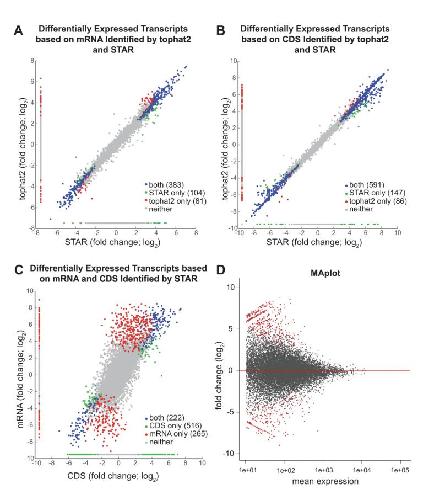 cells based on mRNA and CDS, using STAR. D. MA plot shows the mean expression of transcripts vs its fold