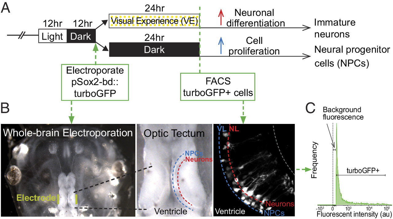 Isolation of neural progenitor cells and immature neurons from the optic tectum. (A) Visual experience paradigm used to enrich for NPCs and immature neurons. Animals were reared in 12 h light/12 h dark until stage 46 when the midbrain was electroporated with pSOX2-bd::tGFP plasmid. After electroporation, animals were randomly divided into two groups, one exposed to enhanced visual experience (VE) for 24 h. (B) Whole brain electroporation labels NPCs and neurons in the optic tectum. Left: Image of the head of the tadpole with electrodes (yellow) on each side of the optic tectum. Middle: Dorsal view of the optic tectum. The ventricle, NPC layer, and neuronal layer are labeled. Right: in vivo 2-photon image of tGFP-labeled NPCs and neurons in the ventricular layer (VL) and neuronal layer (NL). (C) Fluorescence histogram indicates the gate setting of the fluorescence-activated cell sorting (FACS) to isolate tGFP+ cells. Control is set to the background fluorescence from nonelectroporated midbrain cells.