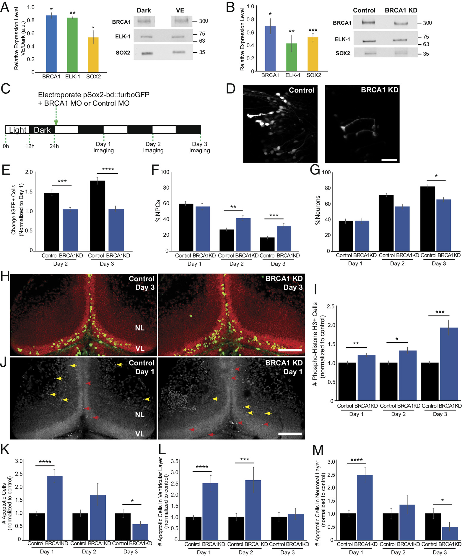 BRCA1 regulates neural progenitor cell fate. (A) BRCA1 (blue), ELK-1 (green), and SOX2 (yellow) expression are increased in animals maintained in the dark compared to enhanced visual experience (VE). Quantitation, normalized to Ponceau staining (Left). n: BRCA1 (5); ELK-1 (4), SOX2 (4). (B) BRCA1 knockdown lowers BRCA1 (blue, n = 5), ELK-1 (green, n = 6), and SOX2 (yellow, n = 6) protein expression. Midbrains were dissected for western blots 2 d after electroporating morpholinos. (C) Diagram of in vivo imaging protocol. Animals were maintained in a 12 h light/12 h dark cycle. After coelectroporation with tGFP and brca1 or control morpholinos, animals were imaged for 3 consecutive days. (D) Representative in vivo images of tGFP+ tectal cells from control morpholino and BRCA1 KD animals. (Scale bar, 50 µm.) (E) BRCA1 KD significantly reduced tGFP+ cell numbers compared to control morpholino-treated animals on days 2 and 3. n = 45 to 46 animals per condition. (F and G) Of the cells shown in (E), the percentage of NPCs significantly increased (F) and neurons decreased (G) with BRCA1 KD compared to control morpholino treatment. (H) Z-projection images showing pH3 immunolabeling (green) and SYTOX nuclear labeling (red) on day 3 in the ventricular layer (VL) and neuronal layer (NL). (Scale bar: 100 µm.) (I) BRCA1 KD significantly increased the total number of pH3+ cells in the tectum compared to control morpholino-treated animals over 3 d. n = 37 to 48 animals per group/timepoint. (J) Confocal Z-projection images of SYTOX-labeled apoptotic nuclei in NPCs in the ventricular layer on day 1 (VL, red arrowheads) and apoptotic neurons in the neuronal layers (NL, yellow arrowheads). (Scale bar: 100 µm.) (K) BRCA1 KD significantly affected the total number of apoptotic cells compared to control morpholino-treated animals. n = 34 to 38 animals per group/timepoint. (L and M) Of the cells shown in (K), BRCA1 KD significantly increased apoptosis in NPCs on days 1 and 2 (L) and in neurons on day 1 compared to control morpholino-treated animals. (M) *P < 0.05, **P < 0.01, ***P < 0.001, and ****P < 0.0001; two-tailed Student’s t test in (A); one-tailed Student’s t test in (B); Mann–Whitney U test in (E–G), (I), and (K–M).