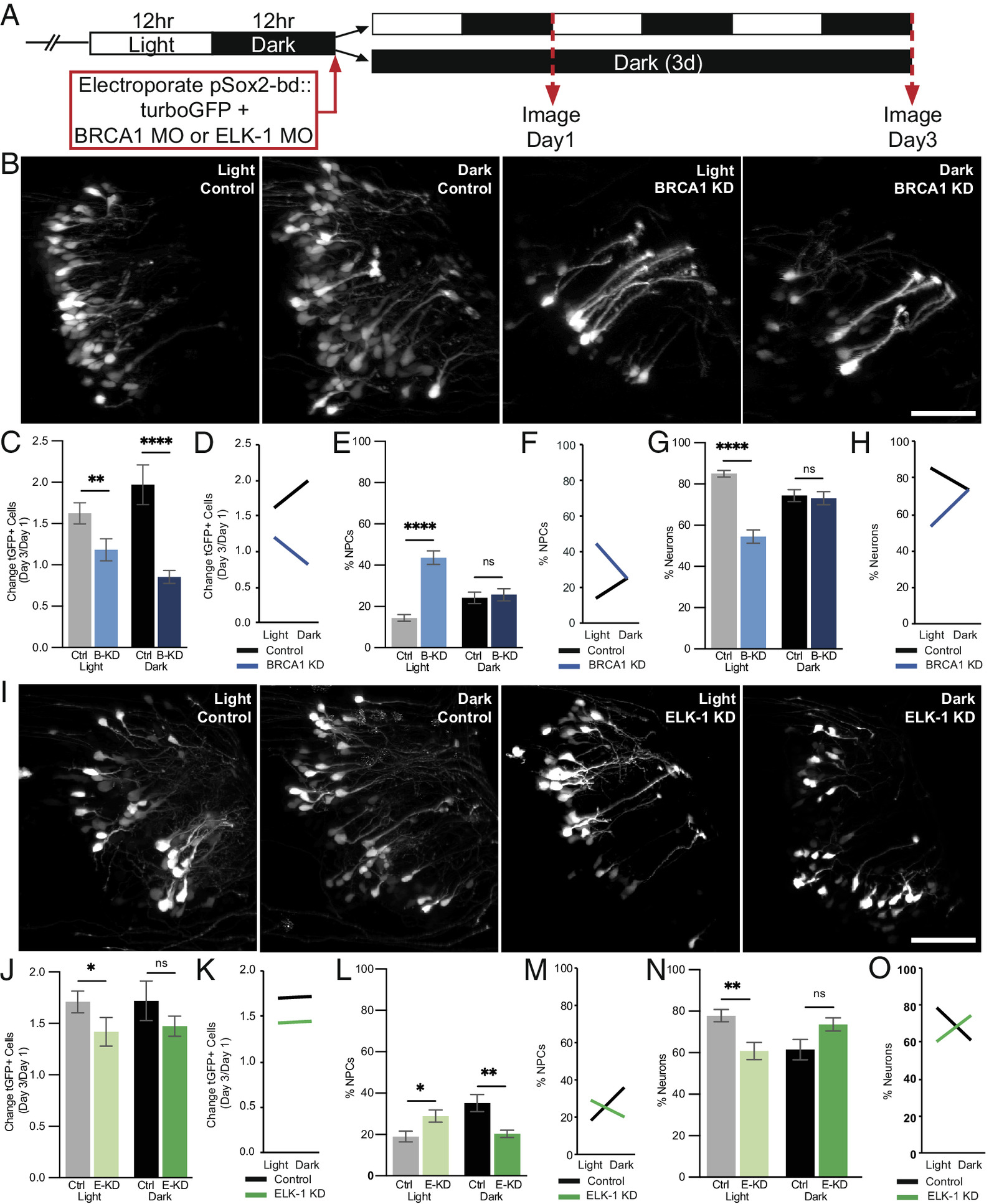 BRCA1 and ELK-1 mediate visual experience–dependent effects on neural progenitor cell fate. (A) Diagram of treatment and imaging protocol. (B–H) BRCA1 mediates the effects of visual stimulation on NPC fate. (B) Representative images of tGFP+ cells collected on day 3 from animals exposed to 12 h light/12 h dark (light) or continuous dark (dark) with BRCA1 KD or control morpholinos. (Scale bar: 50 µm.) (C–H) Quantitative analysis of imaging data. (C) BRCA1 KD (B-KD) blocked the normal increase in GFP+ cells over the 3-d imaging period in animals exposed to 12 h light/12 h dark (light: gray bar vs. light blue bar) or dark (dark: black bar vs. dark blue bar) compared to control morpholino-treated animals. n = 17 to 24 animals per condition/timepoint. (D) Profile plot of data in (C) demonstrating that the effect of visual experience on tGFP+ cell number depends on BRCA1. (E and G) BRCA KD significantly increased NPCs in animals exposed to light [(E) light: gray bar vs. light blue bar] and decreased neurons [(G) light: gray bar vs. light blue bar] compared to control morpholino-treated animals. BRCA1 KD did not affect NPCs (E) or neurons (G) in animals exposed to dark (black vs. dark blue bars). (F and H) Profile plots of data in (E) and (G) demonstrating that the effect of visual experience on NPC fate depends on BRCA1 expression. (I–O) ELK-1 mediates the effects of visual stimulation on NPC fate. (I) Representative images of tGFP+ cells collected on day 3 in animals exposed to light or dark with ELK-1 KD or control morpholinos. (Scale bar: 50 µm.) (J–O) Quantitative analysis of in vivo imaging data. (J) ELK-1 KD (E-KD) blocked the normal increase in GFP+ cells in animals exposed to light (light: gray vs. light green bars) but not dark (black vs. dark green bars) compared to control morpholino-treated animals. n = 11 to 14 animals per condition/timepoint. (K) Profile plot of factorial comparison of data in (I), demonstrates that the effect of visual experience on the total number of tGFP+ cells is not dependent on ELK-1. (L) ELK-1 KD significantly increased NPCs under light conditions (gray vs. light green bars) and significantly decreased neural progenitors under dark conditions (black vs. dark green bars) compared to control morpholino-treated animals. (N) ELK-1 KD significantly decreased neurons in animals exposed to light (gray vs. light green bars) but did not significantly affect neurons in animals in dark (black vs. dark green bars) compared to control morpholino-treated animals. (M and O) Profile plots of data in (L) and (N) demonstrate that the effect of visual experience conditions on the fate of NPCs and neurons depends on ELK-1 expression. *P < 0.05, **P < 0.01, ***P < 0.001, and ****P < 0.0001; Mann–Whitney U test in (C), (E), (G), (J), (L), and (N). Two-way ANOVA analysis was used in (D), (F), (H), (K), (M), and (O).