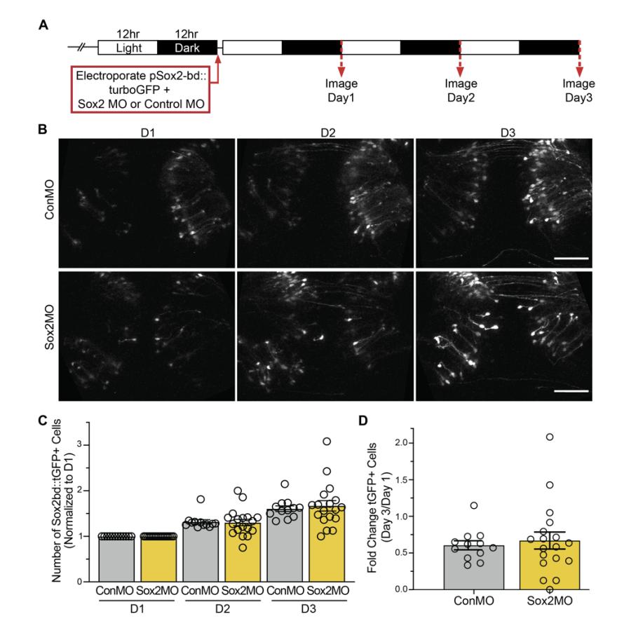 groups. D. Difference in fold-change of Sox2bd::tGFP positive cells over the 3 day experiment is not significant
